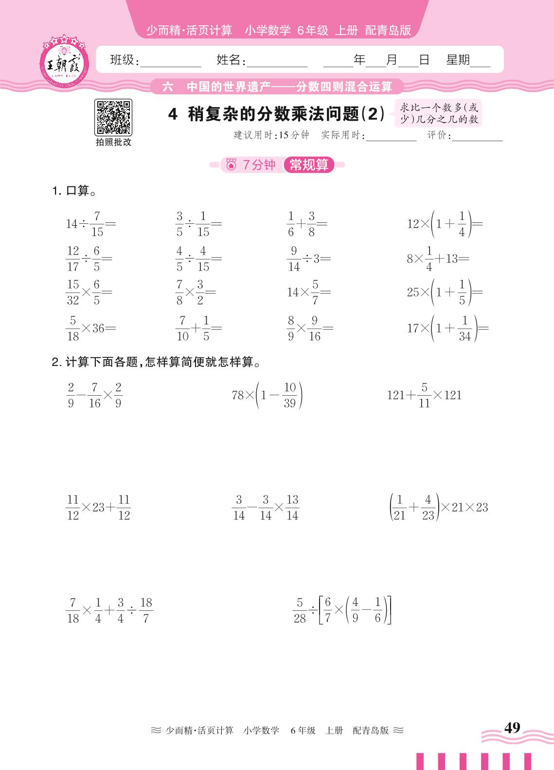 2024秋上册六年级数学青岛版 第六单元 中国的世界遗产(分数四则混合运算)——4. 稍复杂的分数乘法问题(2)