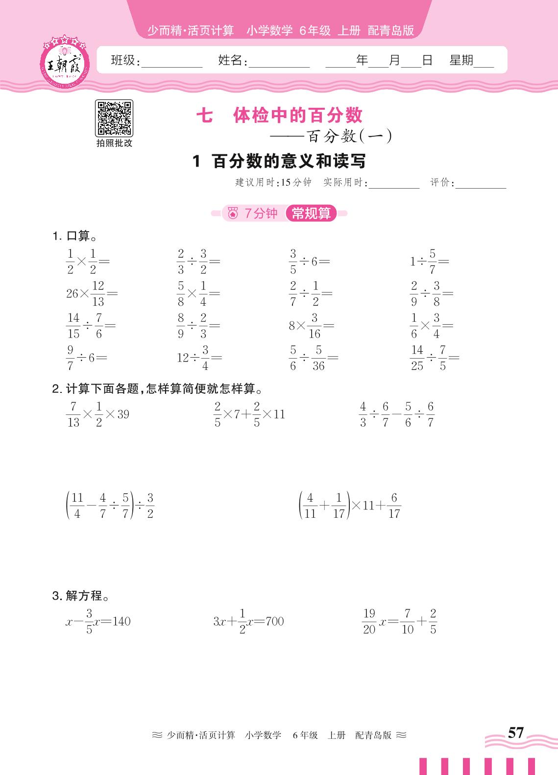2024秋上册六年级数学青岛版 第七单元 体检中的百分数——1. 百分数的意义和读写