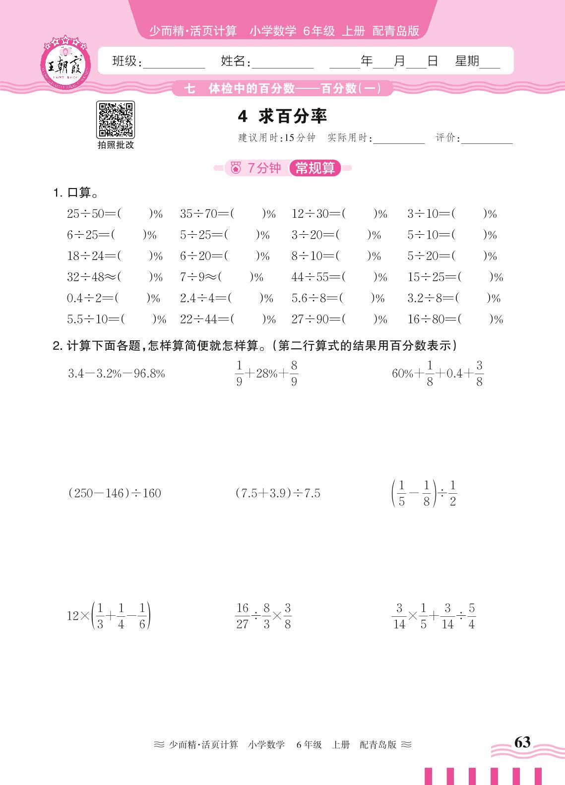 2024秋上册六年级数学青岛版 第七单元 体检中的百分数——4. 求百分率