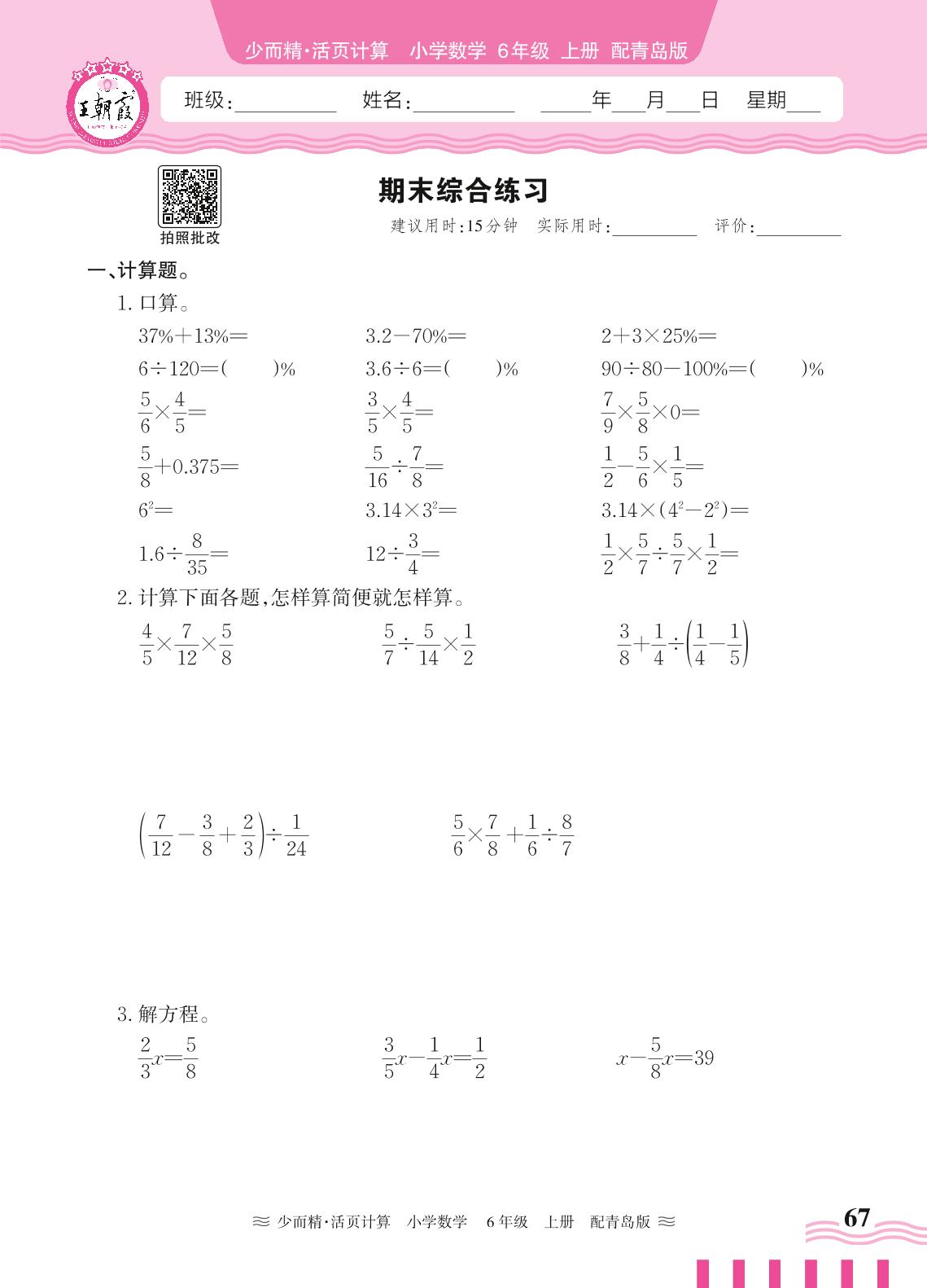 2024秋上册六年级数学青岛版 期末综合练习(计算专练)