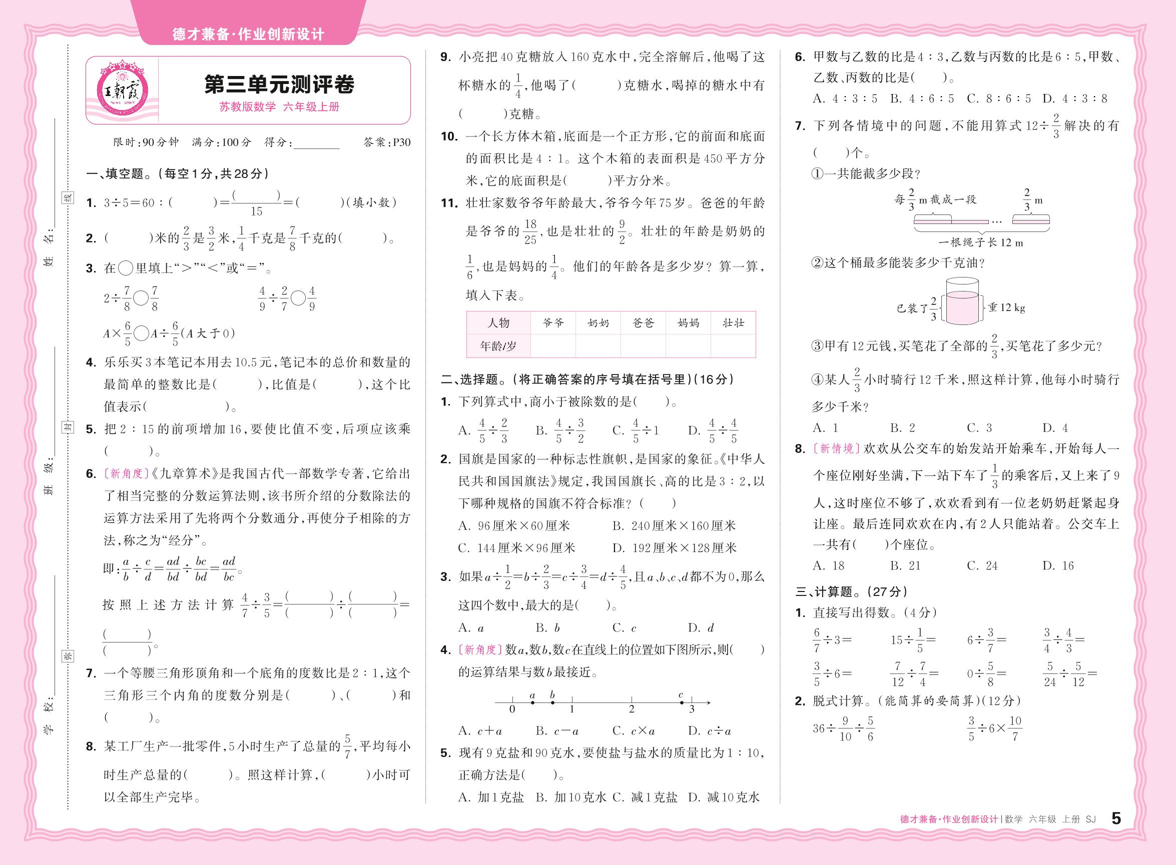 2024秋上册六年级数学苏教版 第三单元测评卷