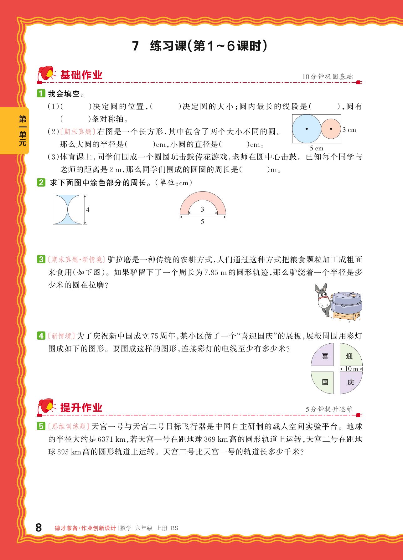 2024秋上册六年级数学北师版 第一单元 圆——7. 圆的认识(一)、圆的认识(二)、欣赏与设计、圆的周长练习课