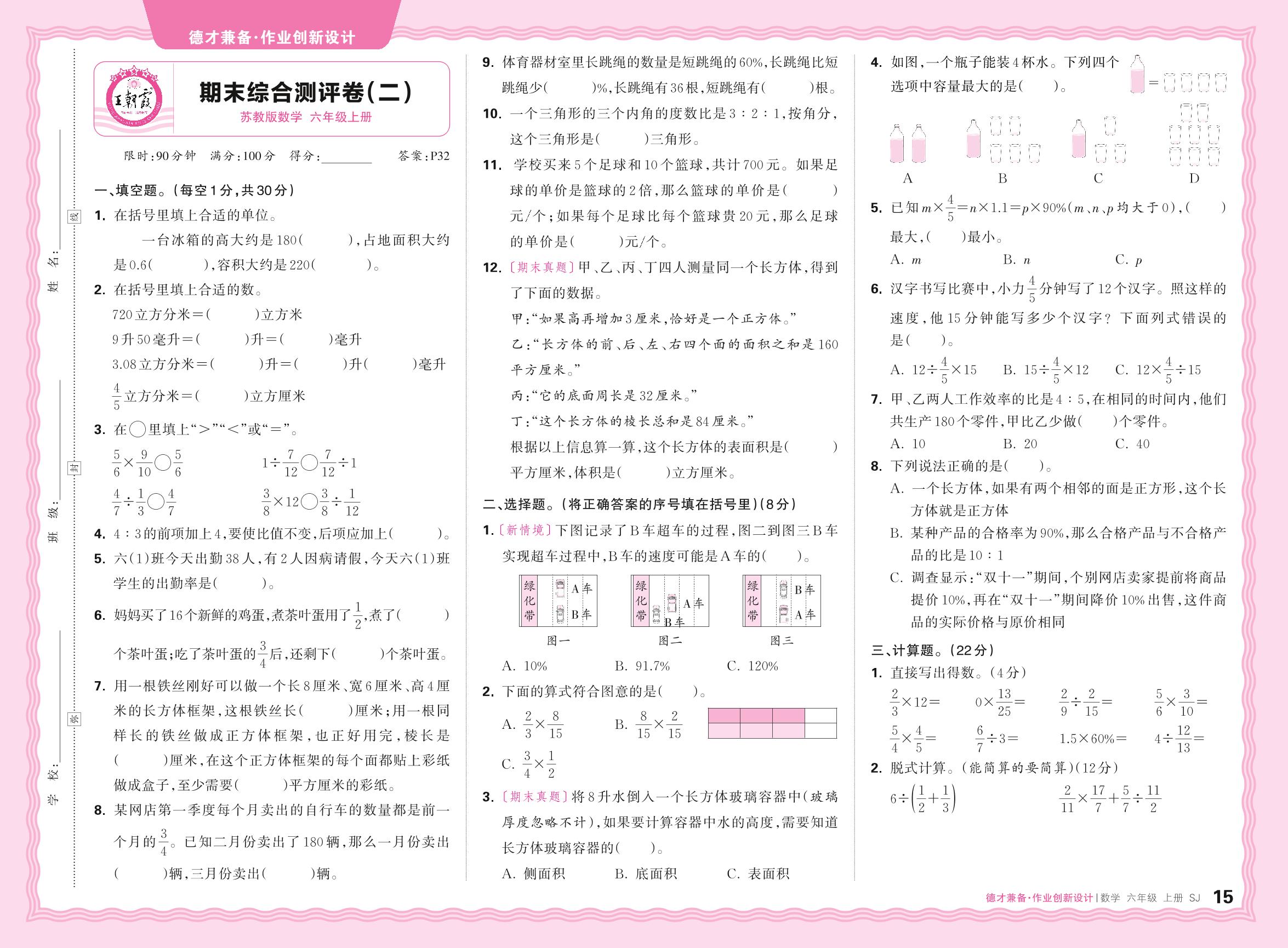 2024秋上册六年级数学苏教版 期末综合测评卷(二)