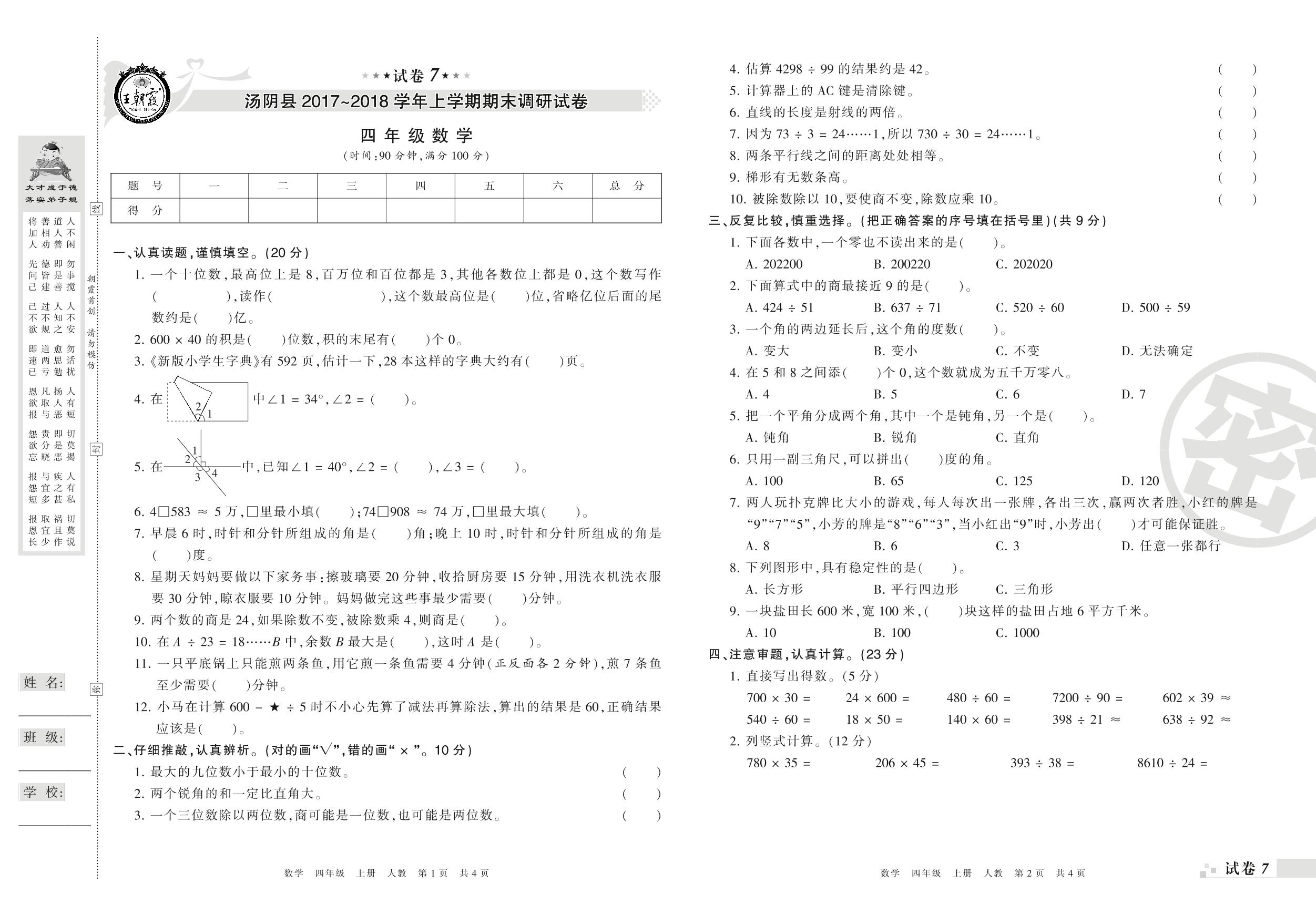 2017-2018学年第一学期安阳市汤阴县四年级数学试卷(人教版)【7】