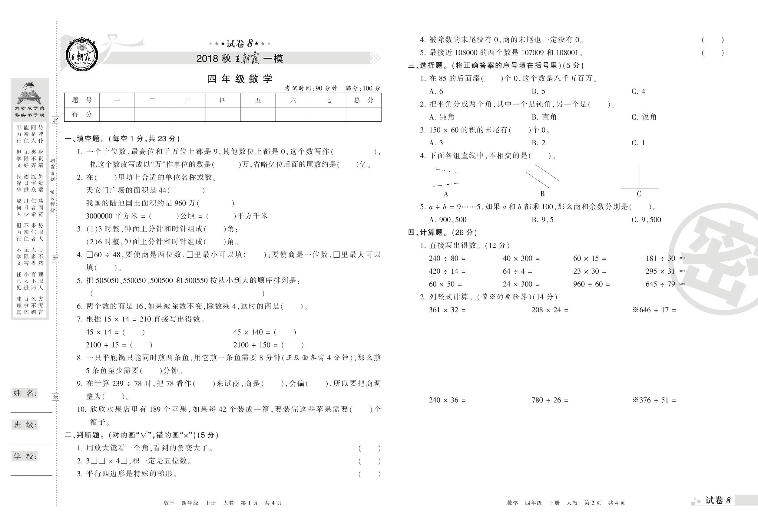 王朝霞期末模拟卷四年级上册数学(人教版)_R210804155834【8】