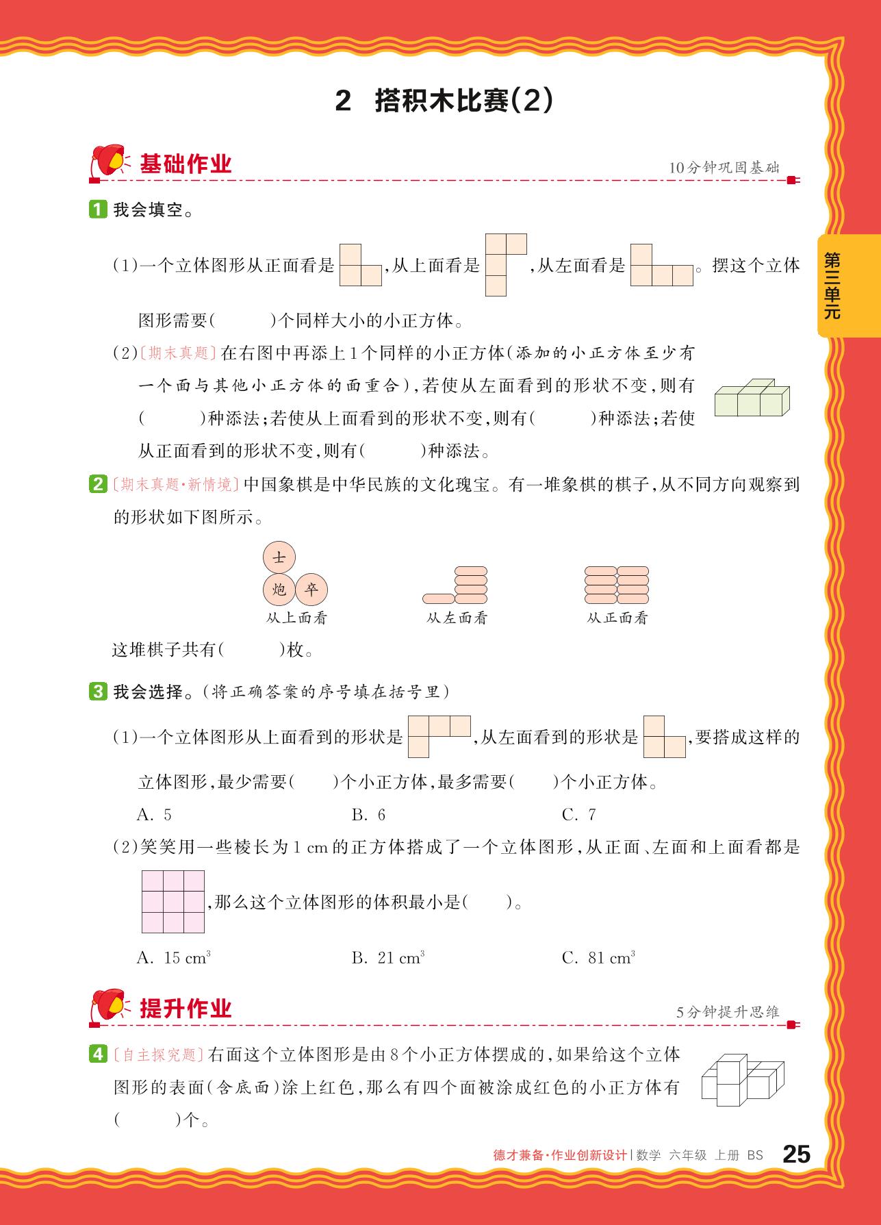 2024秋上册六年级数学北师版 第三单元 观察物体——2. 搭积木比赛(2)