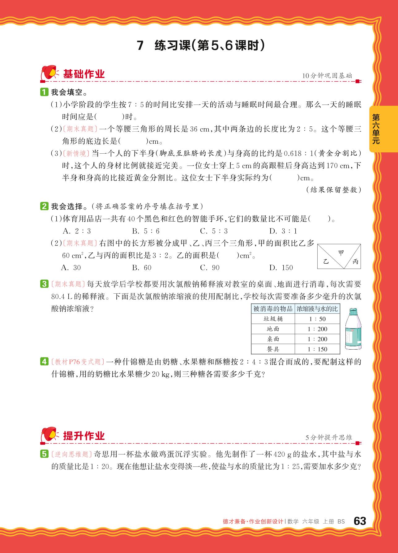 2024秋上册六年级数学北师版 第六单元 比的认识——7. 比的应用练习课