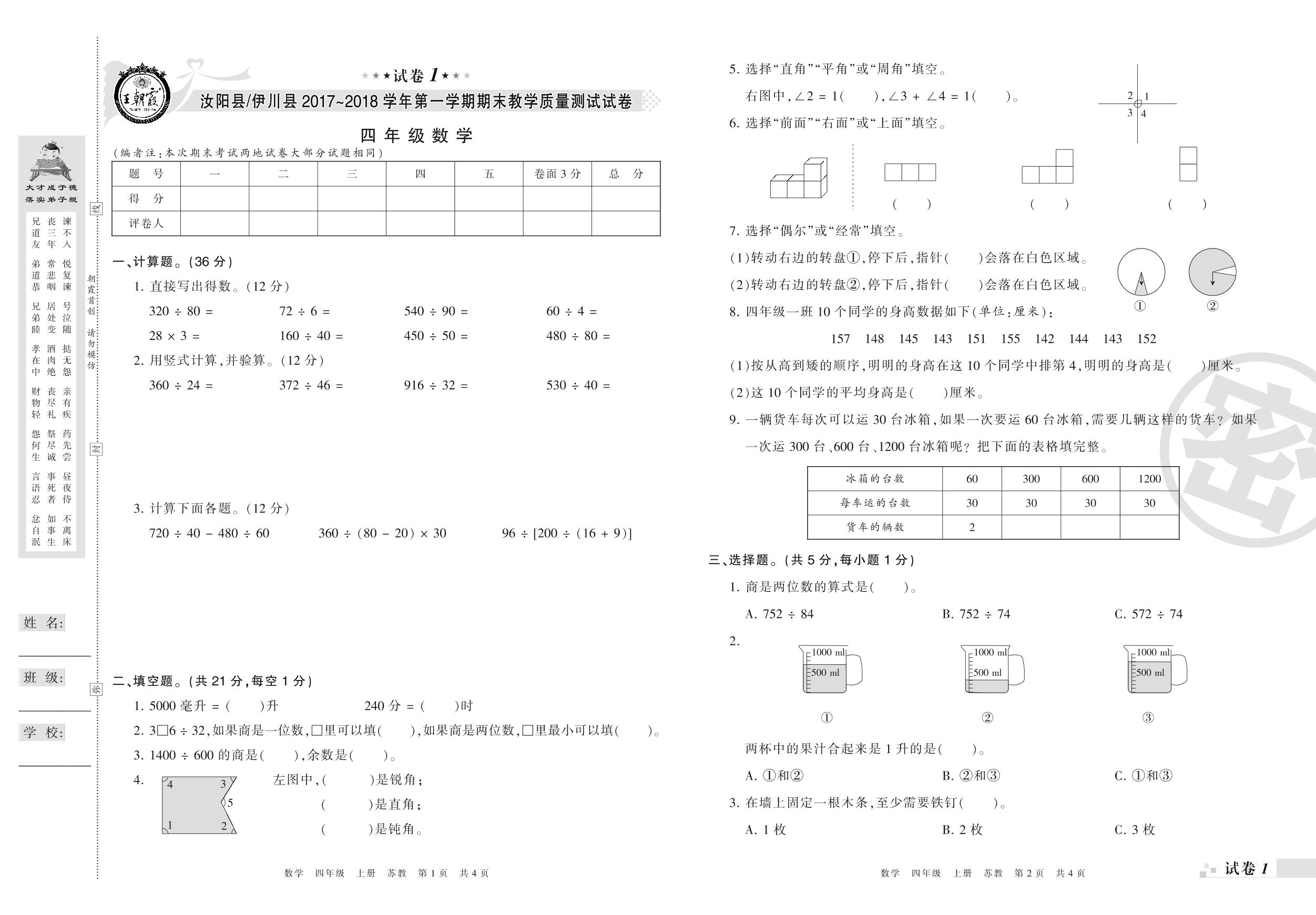 2017-2018学年第一学期洛阳市汝阳县、伊川县四年级数学试卷(苏教版)【1】