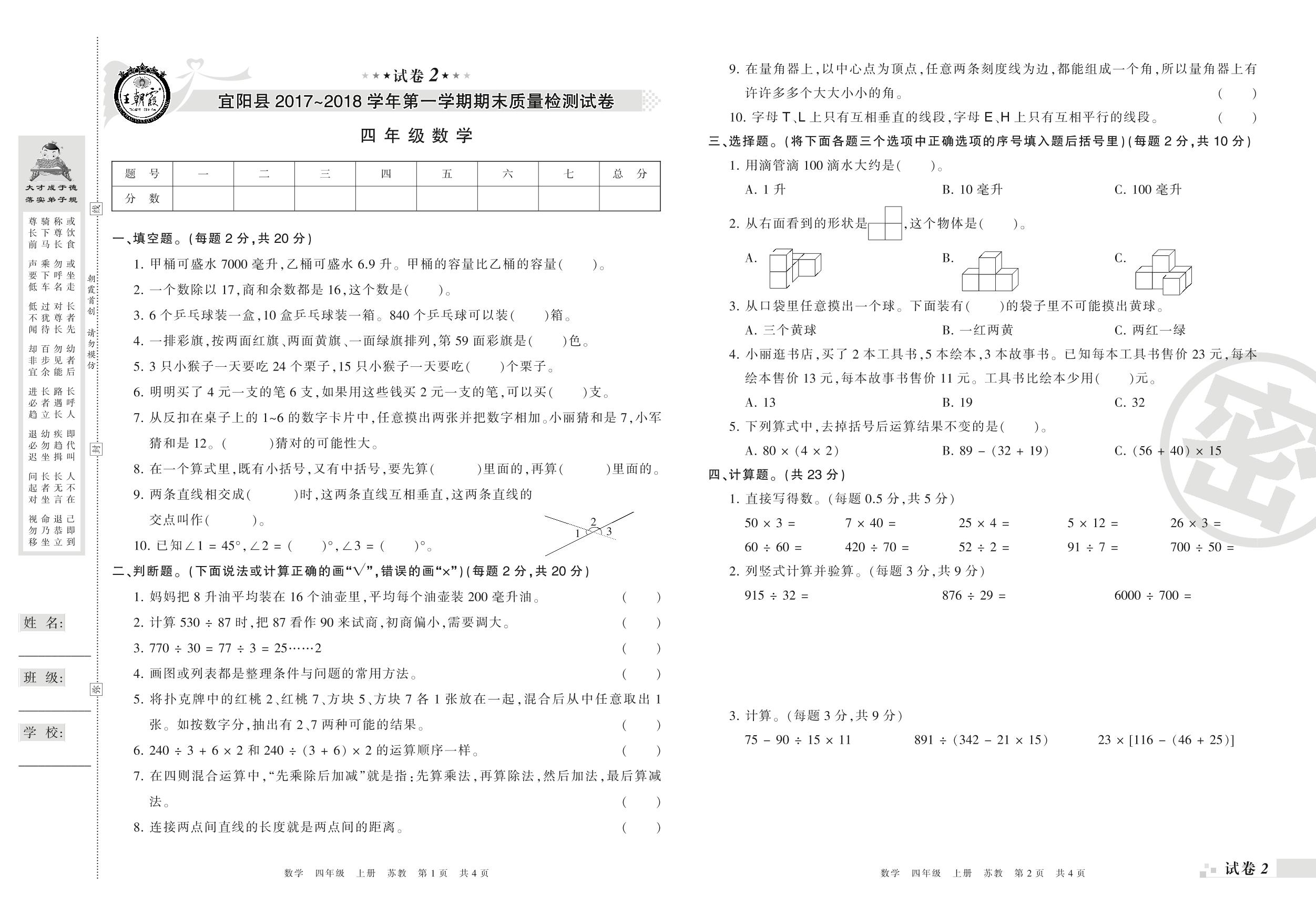 2017-2018学年第一学期洛阳市宜阳县四年级数学试卷(苏教版)【2】