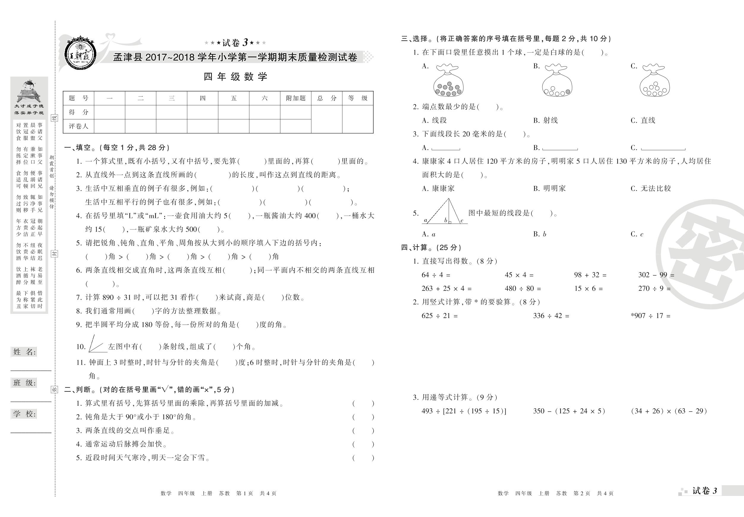 2017-2018学年第一学期洛阳市孟津县四年级数学试卷(苏教版)【3】