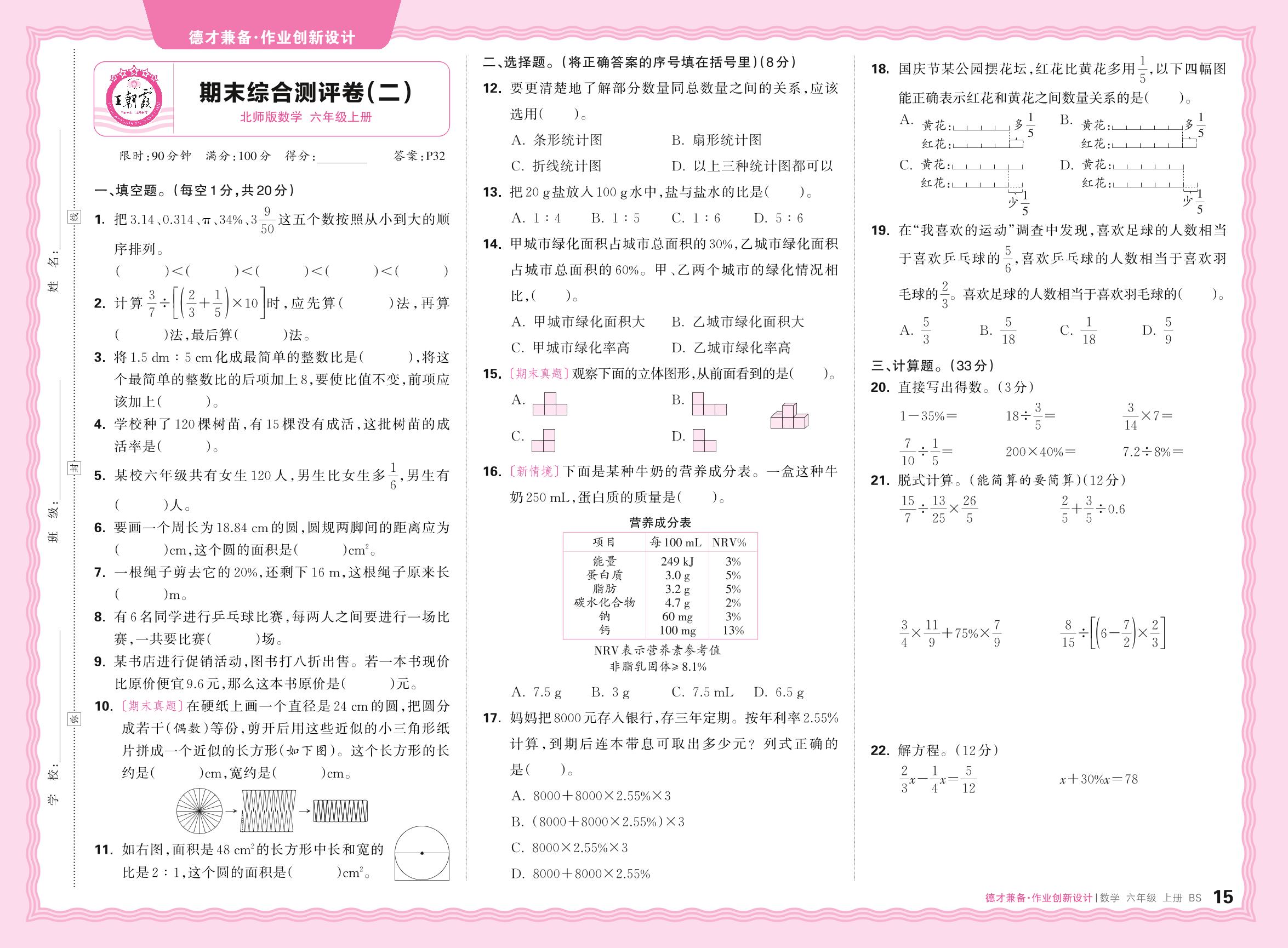 2024秋上册六年级数学北师版 期末综合测评卷(二)