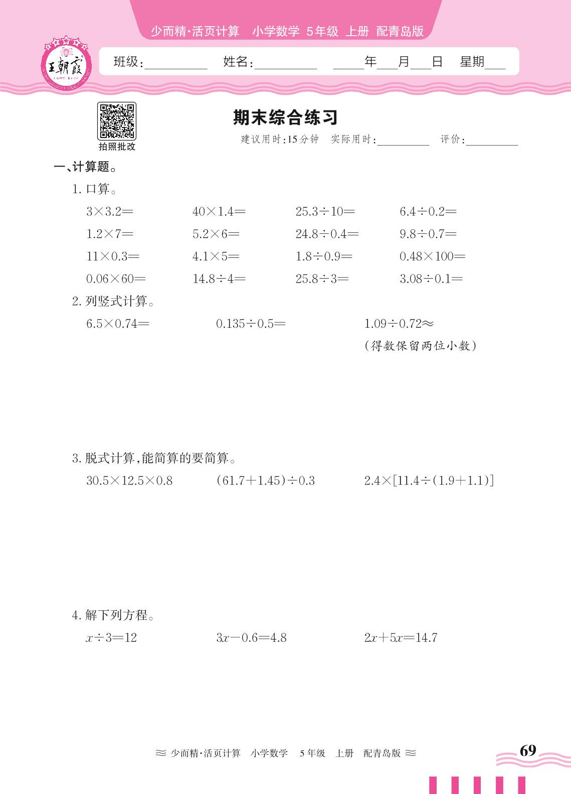 2024秋上册五年级数学青岛版 期末综合练习(计算专练)