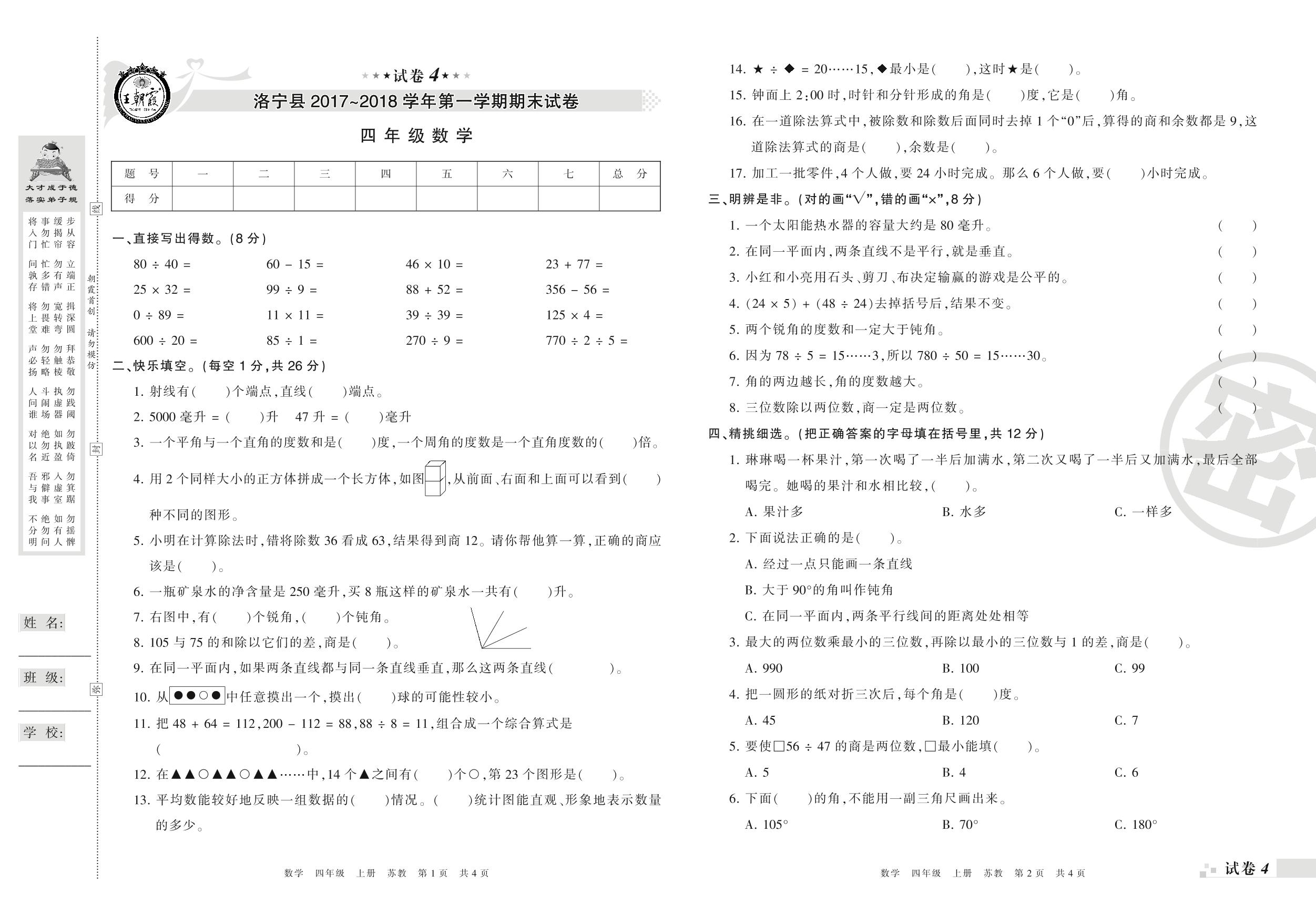 2017-2018学年第一学期洛阳市洛宁县四年级数学试卷(苏教版)【4】
