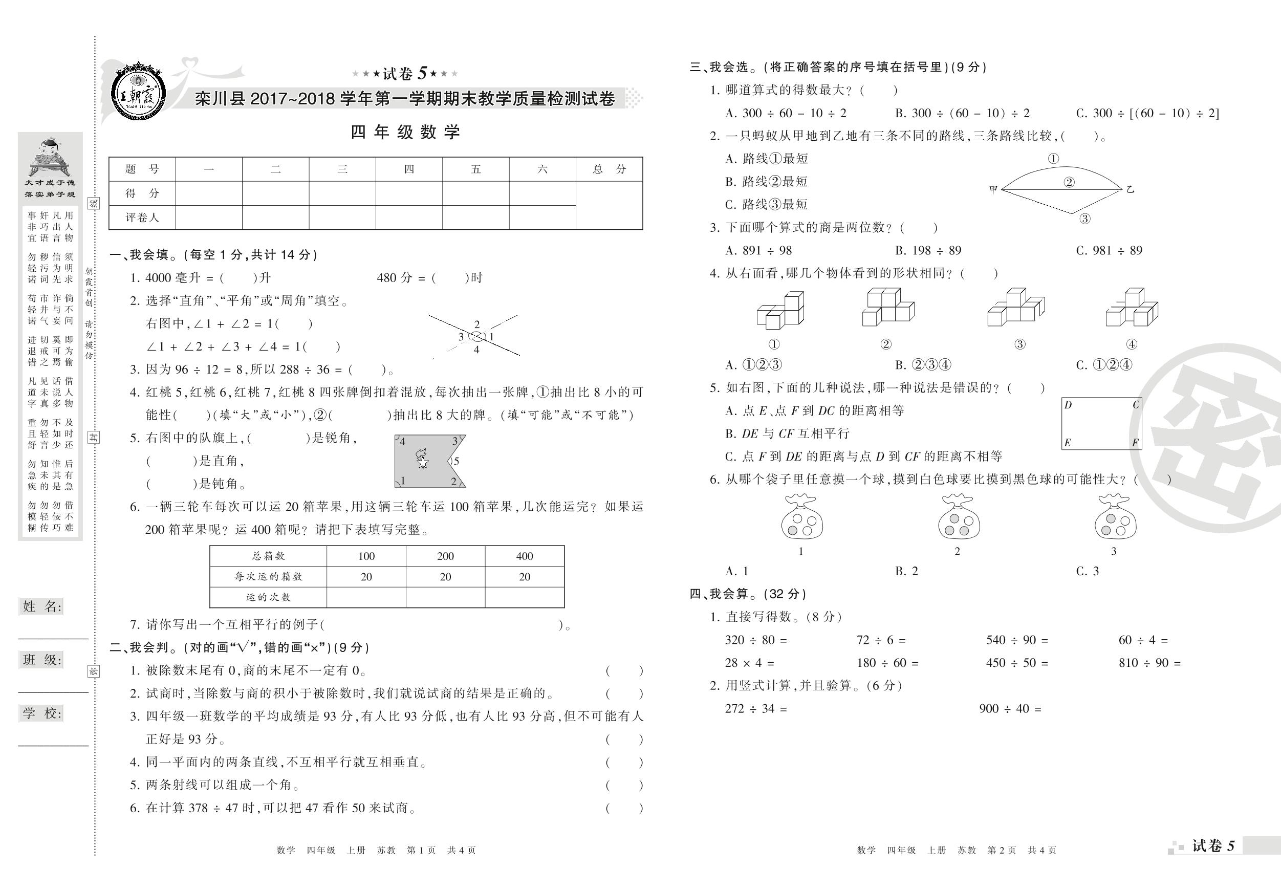 2017-2018学年第一学期洛阳市栾川县四年级数学试卷(苏教版)【5】