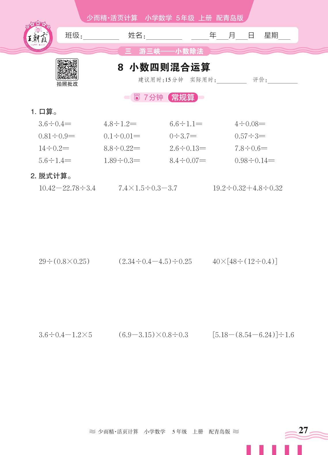 2024秋上册五年级数学青岛版 第三单元 游三峡(小数除法)——8. 小数四则混合运算