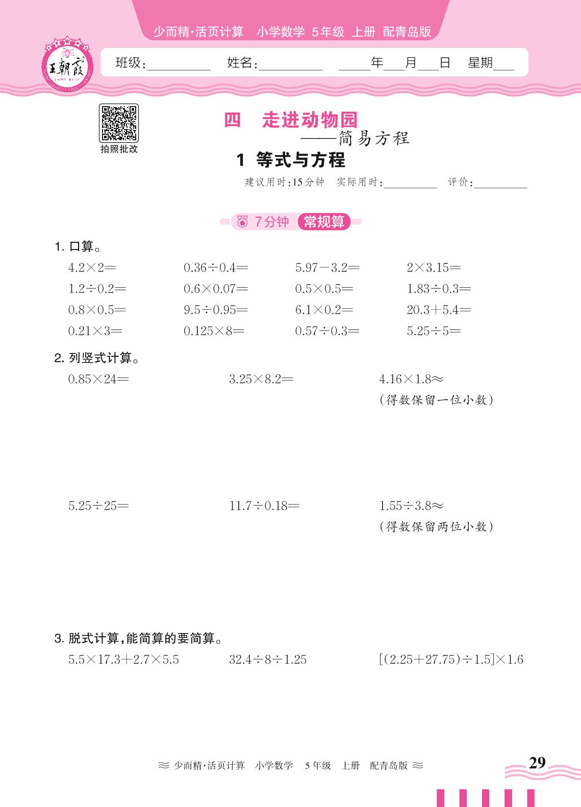2024秋上册五年级数学青岛版 第四单元 走进动物园(简易方程)——1. 等式与方程