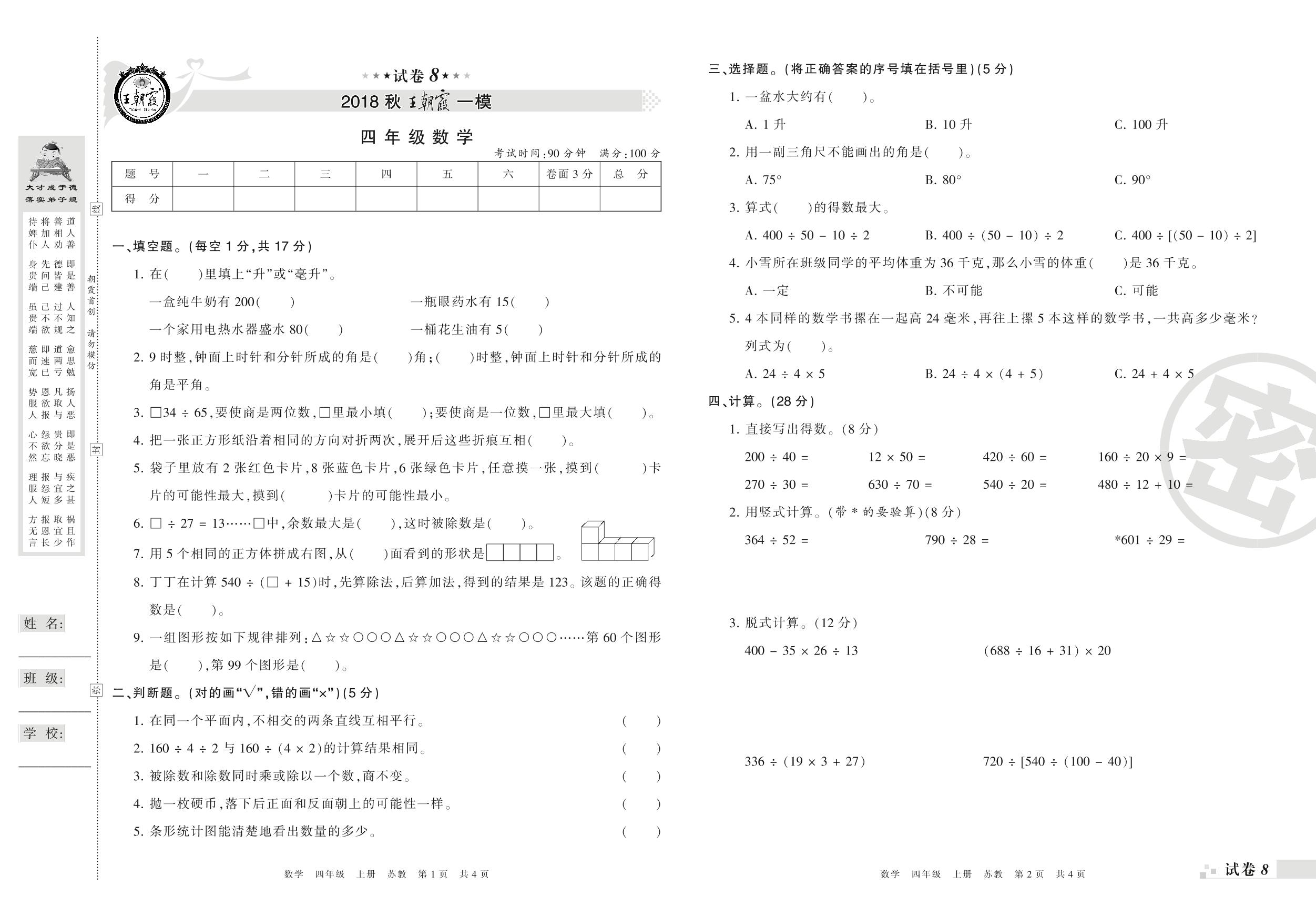 王朝霞期末模拟卷四年级上册数学(苏教版)_R210804155903【8】