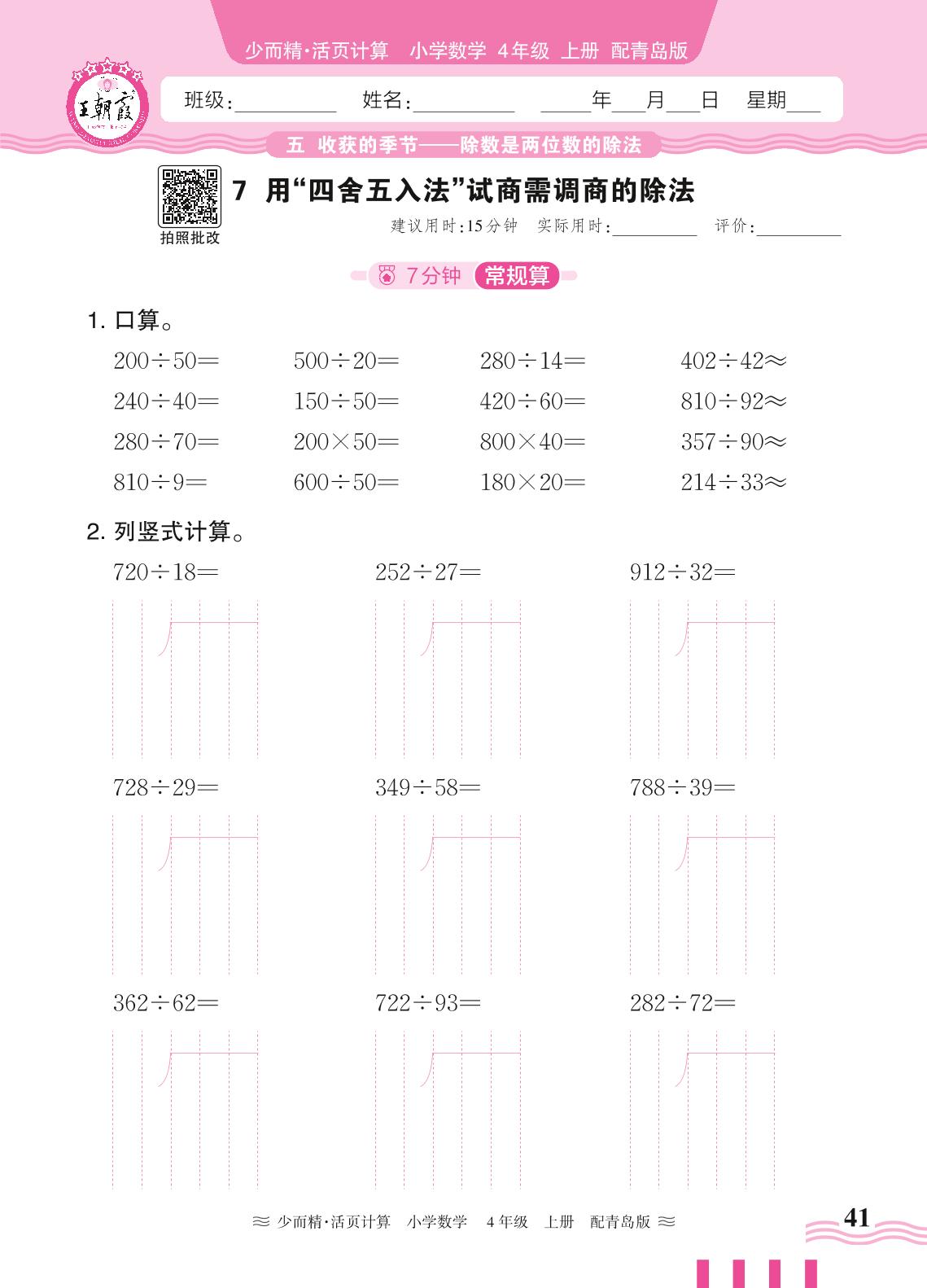 2024秋上册四年级数学青岛版 第五单元 收获的季节(除数是两位数的除法)——7. 用“四舍五入法”试商需调商的除法