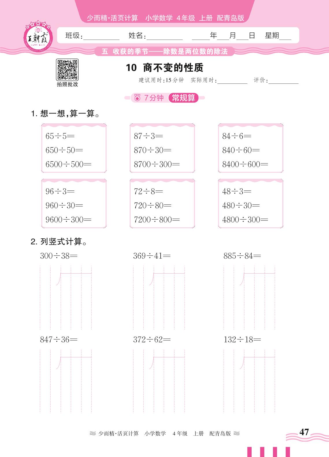 2024秋上册四年级数学青岛版 第五单元 收获的季节(除数是两位数的除法)——10. 商不变的性质