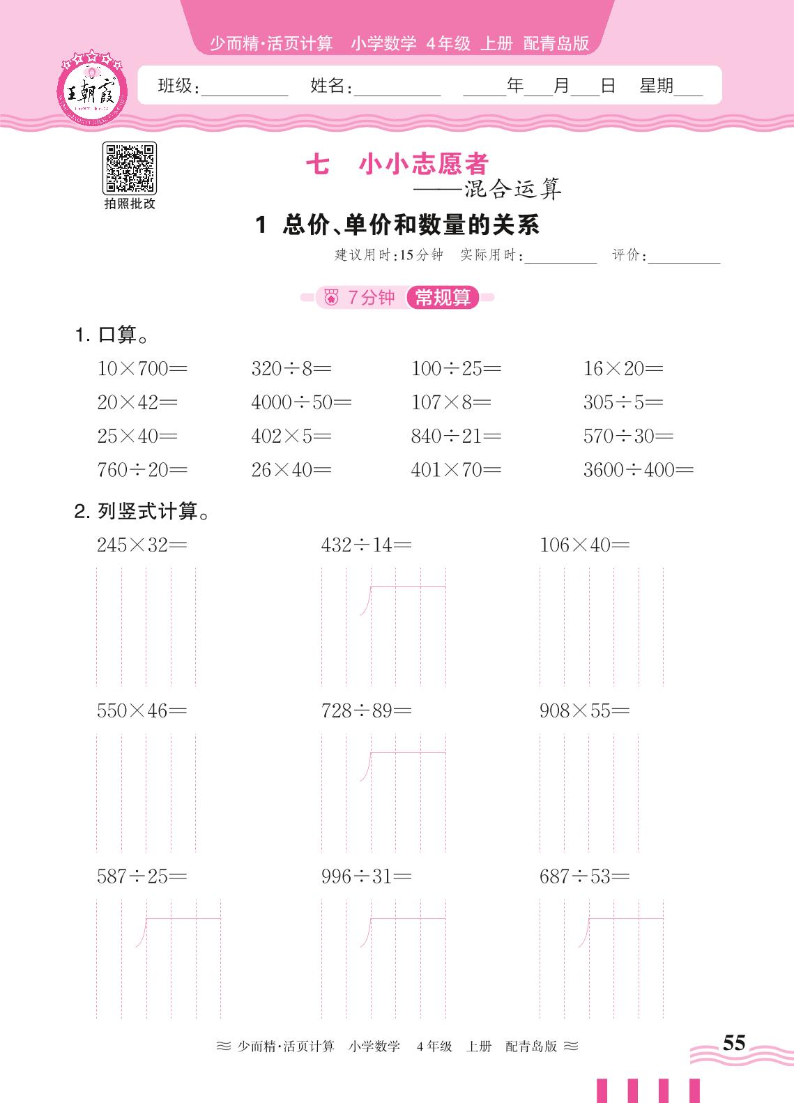 2024秋上册四年级数学青岛版 第七单元 小小志愿者(混合运算)——1. 总价、单价和数量的关系
