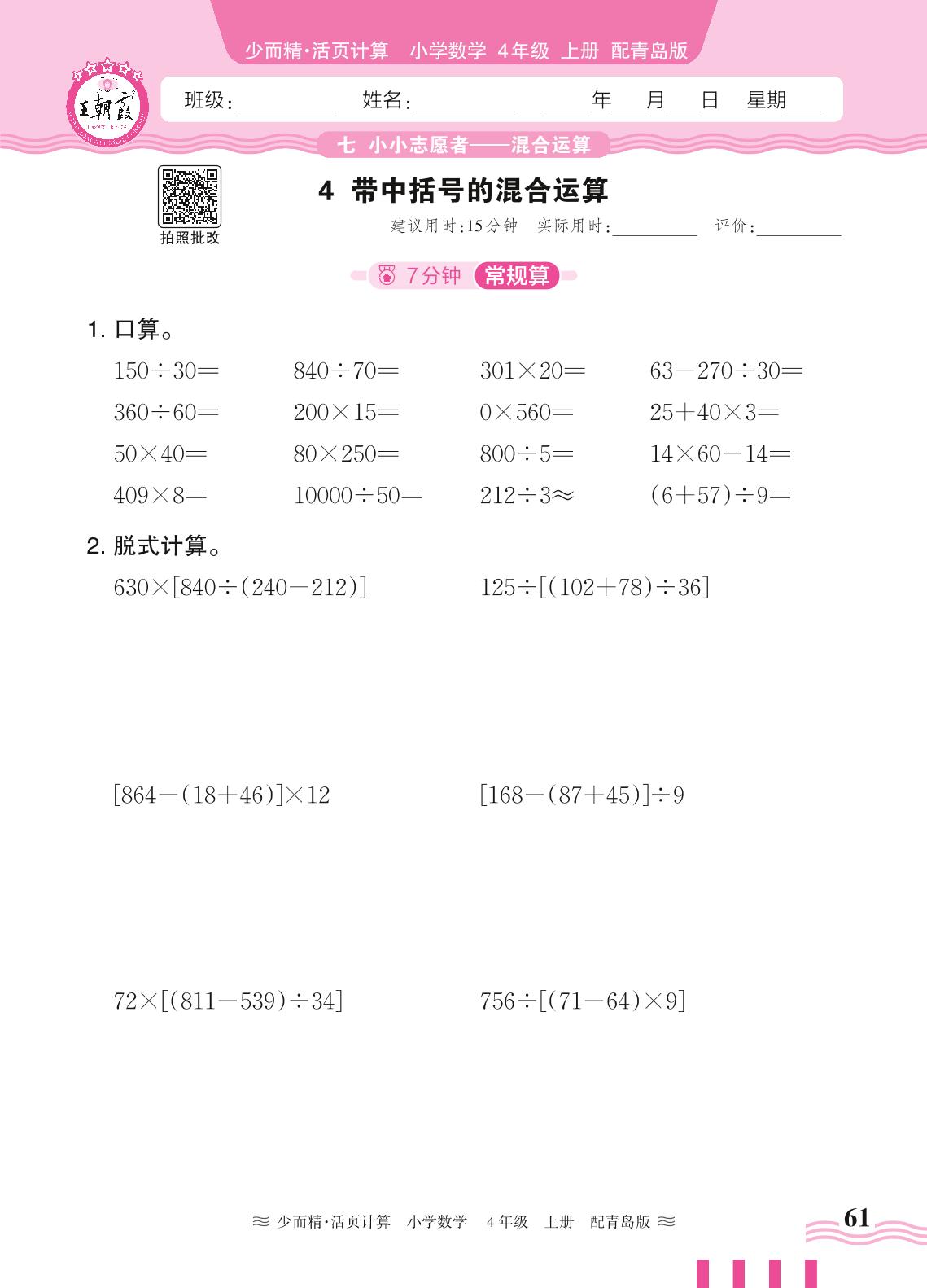2024秋上册四年级数学青岛版 第七单元 小小志愿者(混合运算)——4. 带中括号的混合运算