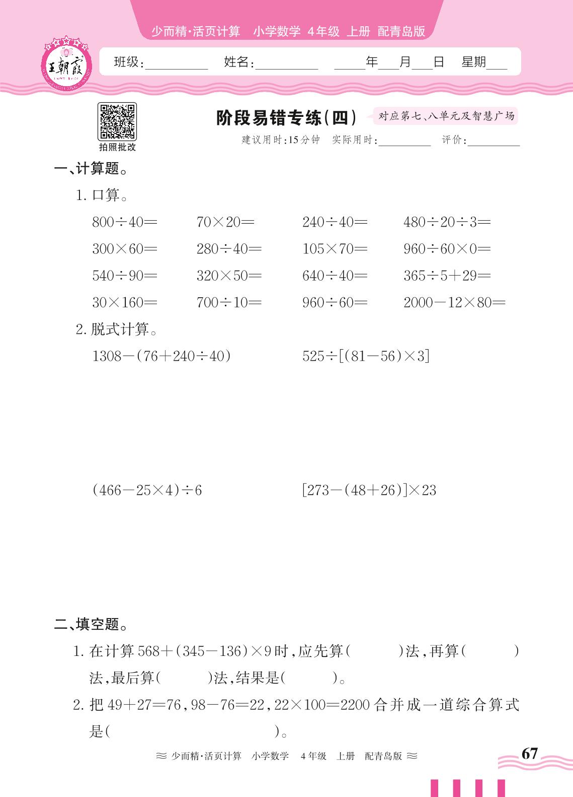 2024秋上册四年级数学青岛版 第七、八单元 阶段易错专练
