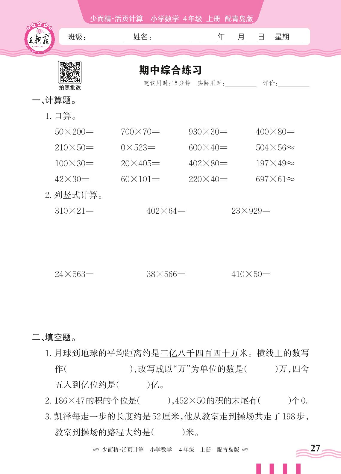 2024秋上册四年级数学青岛版 期中综合练习(计算专练)_R240819160655125