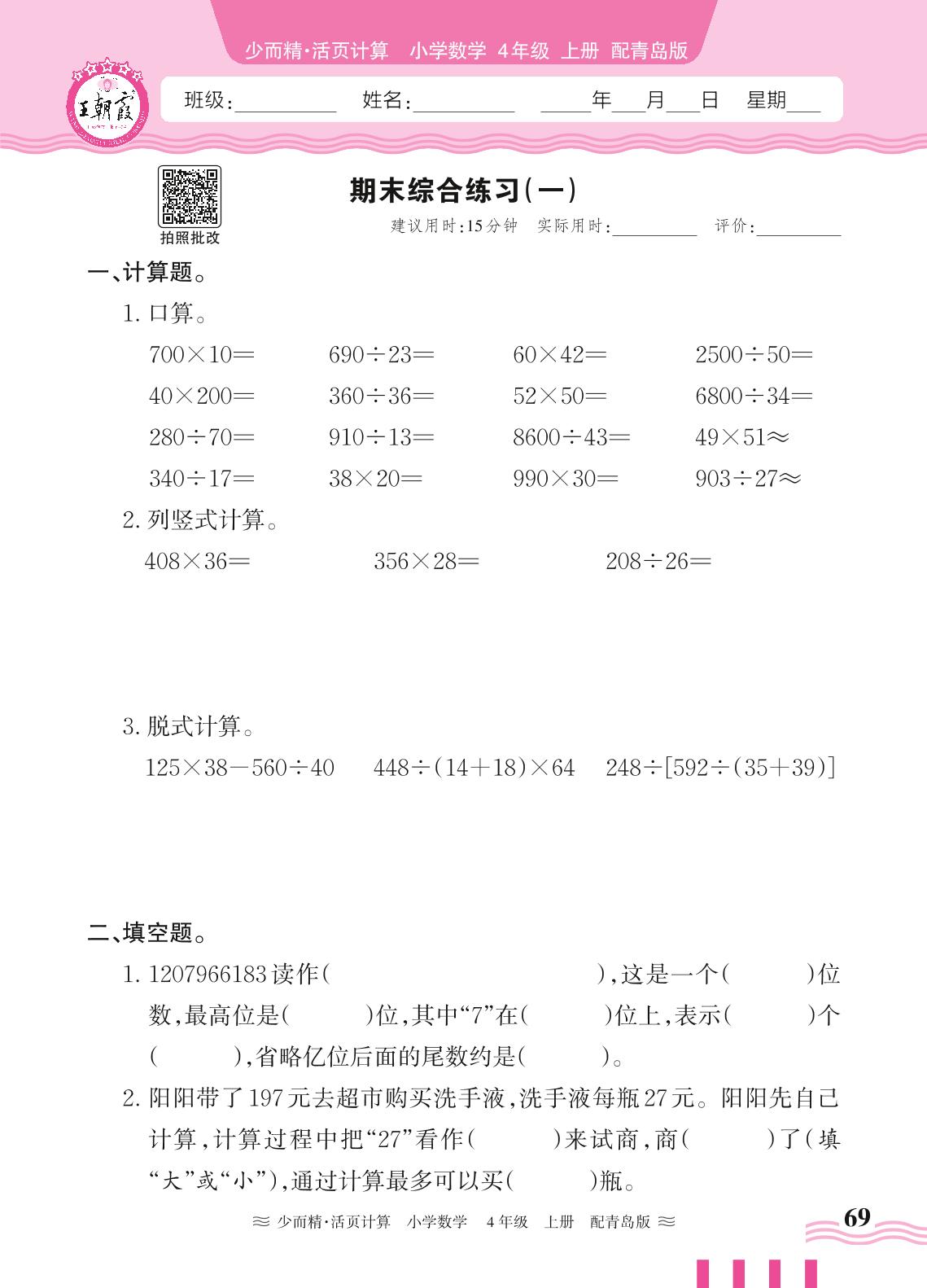 2024秋上册四年级数学青岛版 期末综合练习(一)(计算专练)