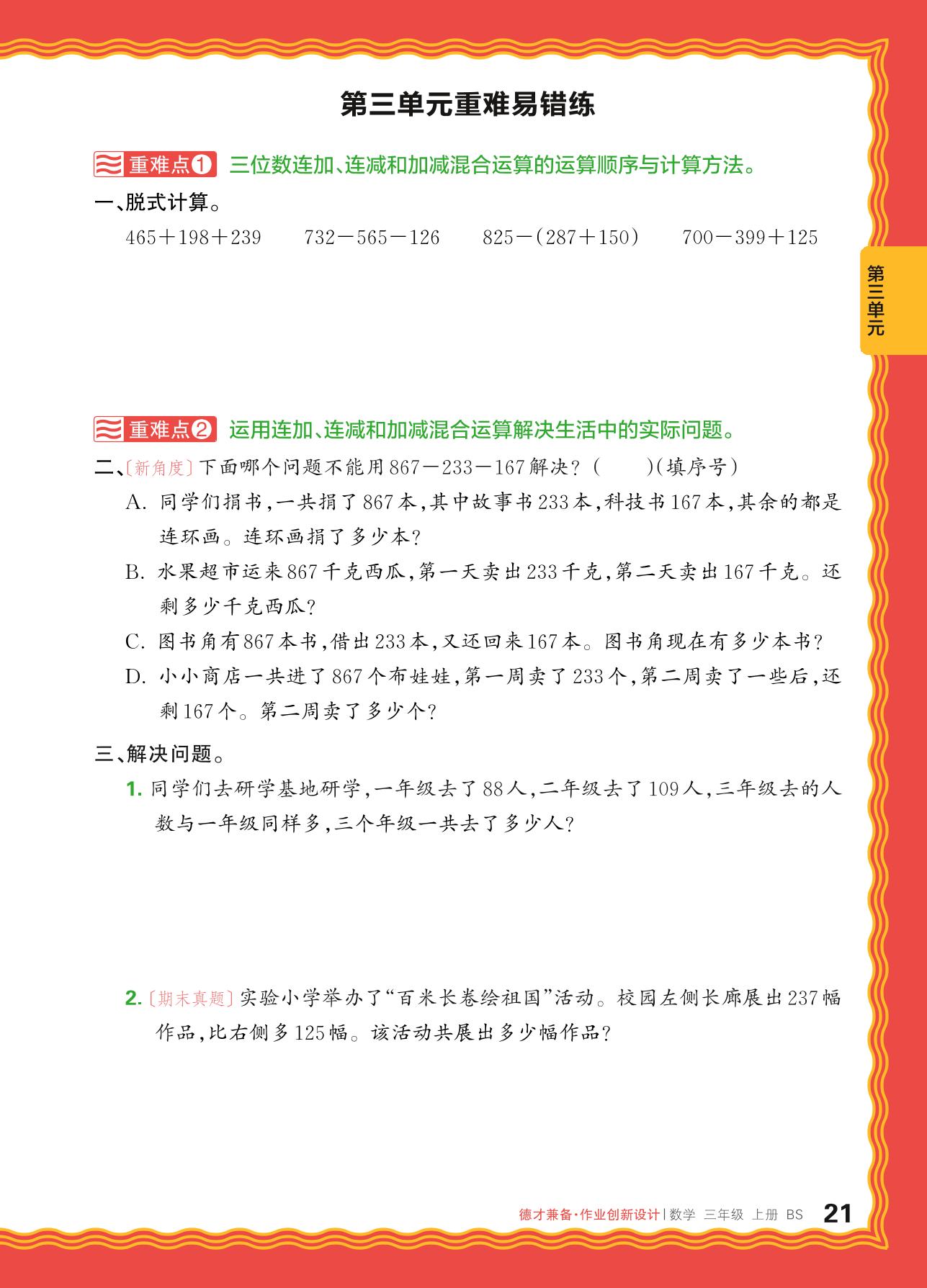 2024秋上册三年级数学北师版 第三单元重难易错练