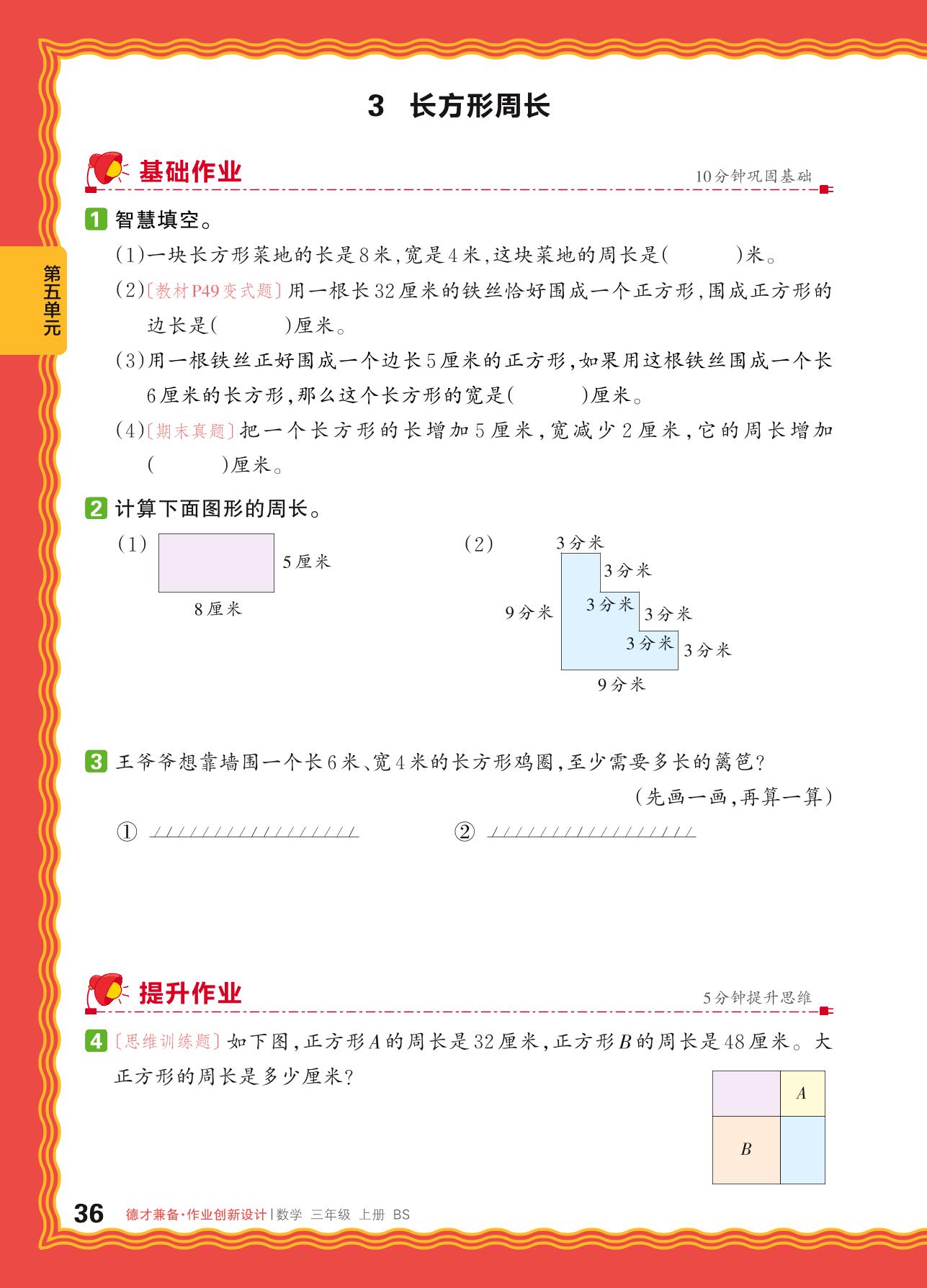 2024秋上册三年级数学北师版 第五单元 周长——3. 长方形周长