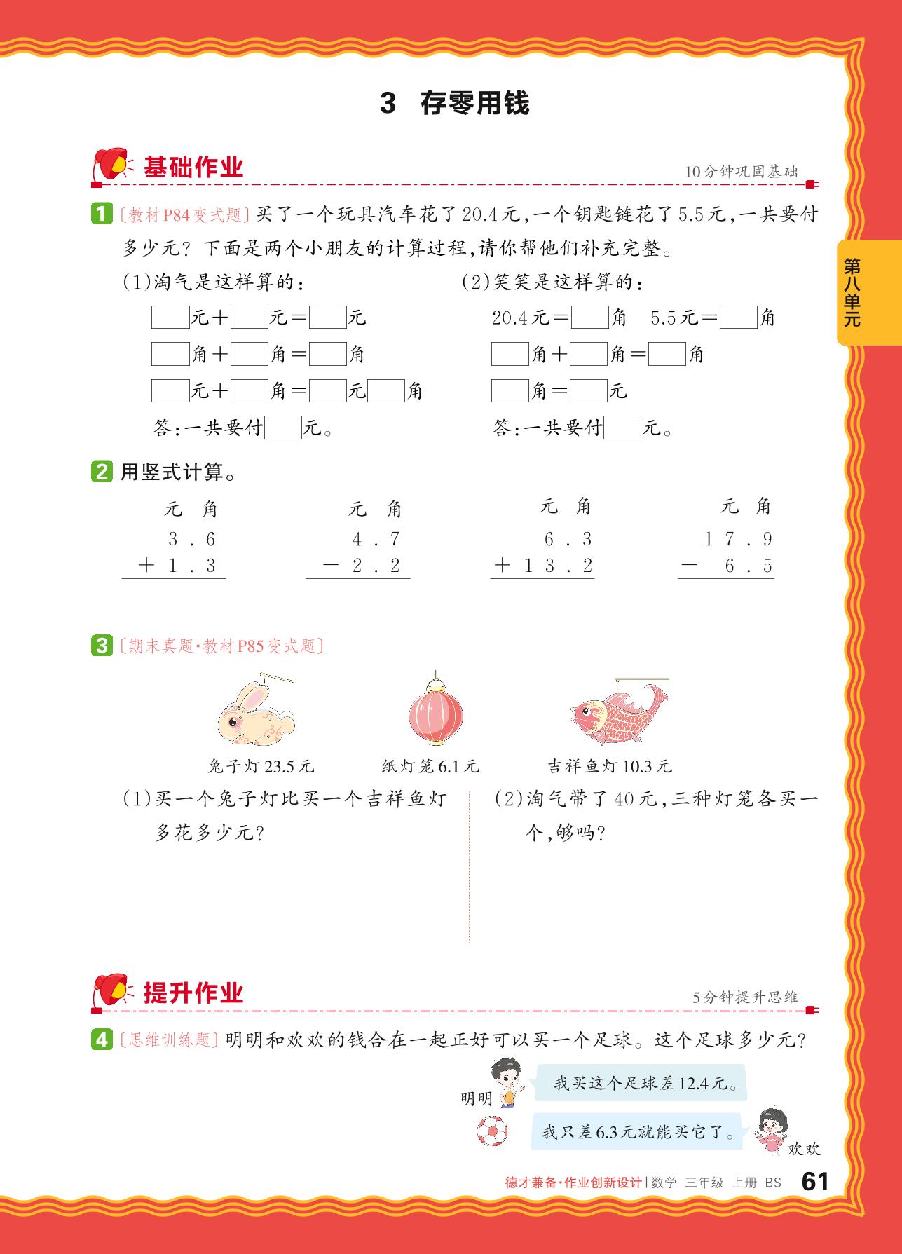 2024秋上册三年级数学北师版 第八单元 认识小数——3. 存零用钱_R240819161408535