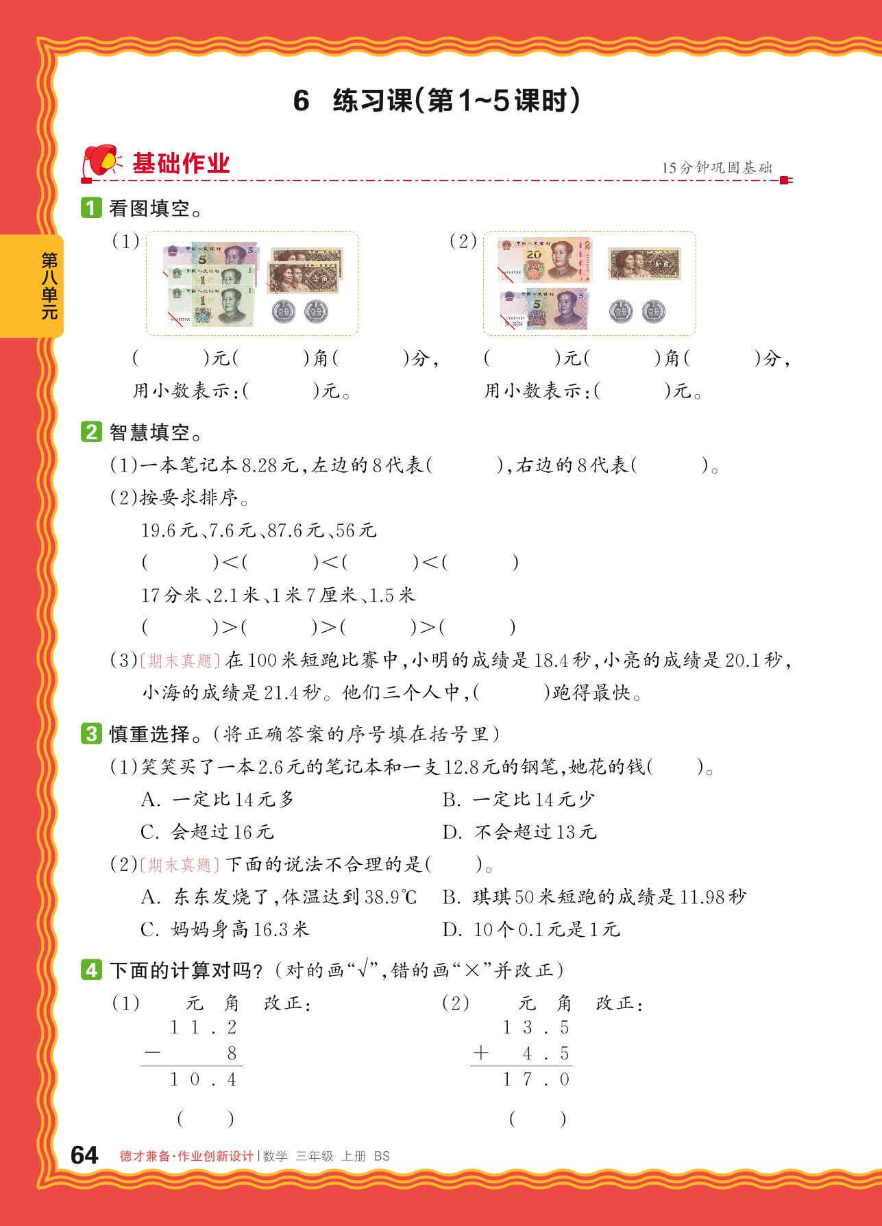 2024秋上册三年级数学北师版 第八单元 认识小数练习课