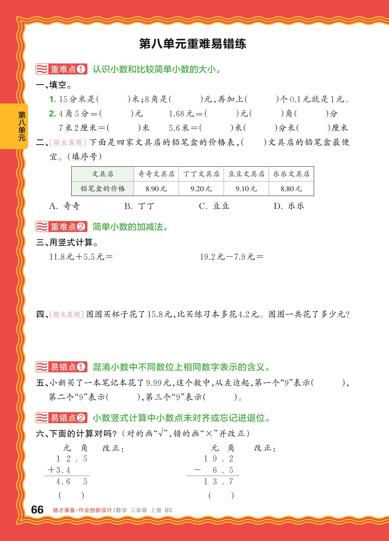 2024秋上册三年级数学北师版 第八单元重难易错练