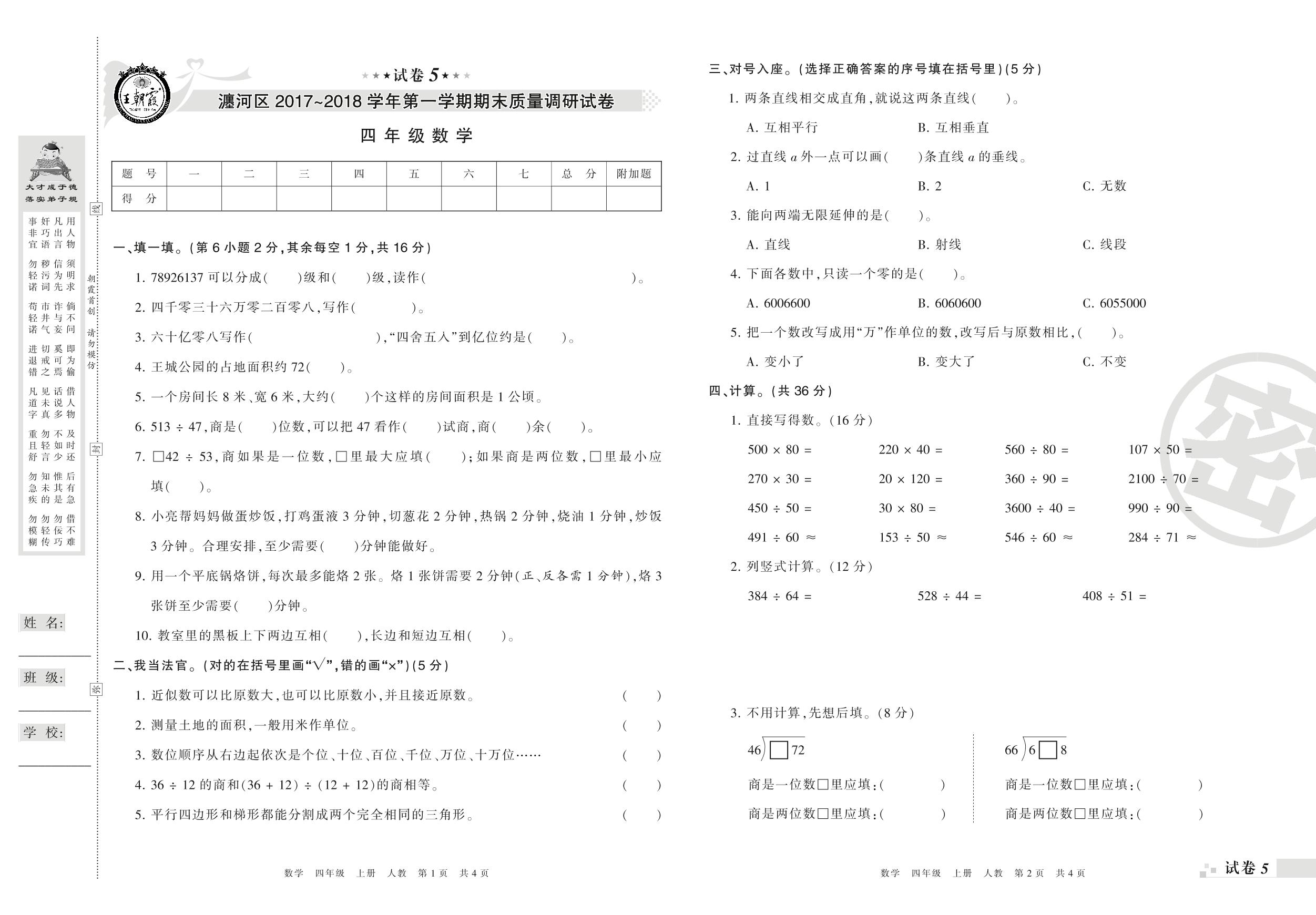 2017-2018学年第一学期洛阳市瀍河区四年级数学试卷(人教版)【5】