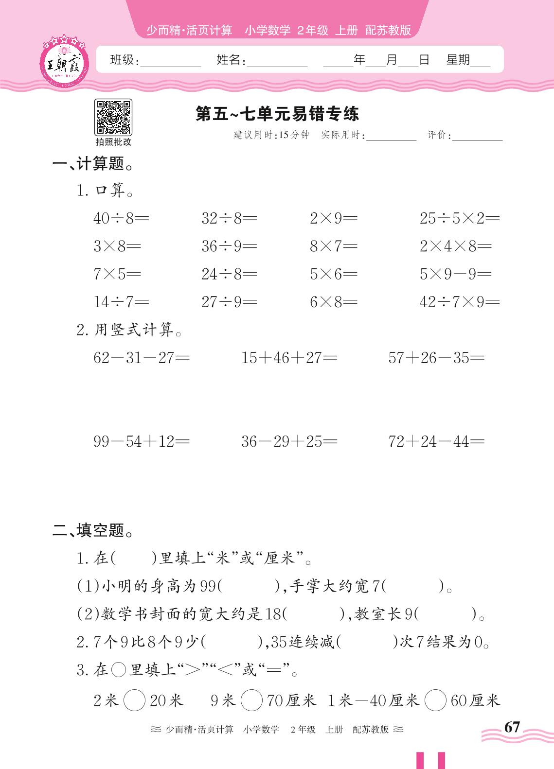 二年级数学苏教版上册专项卷