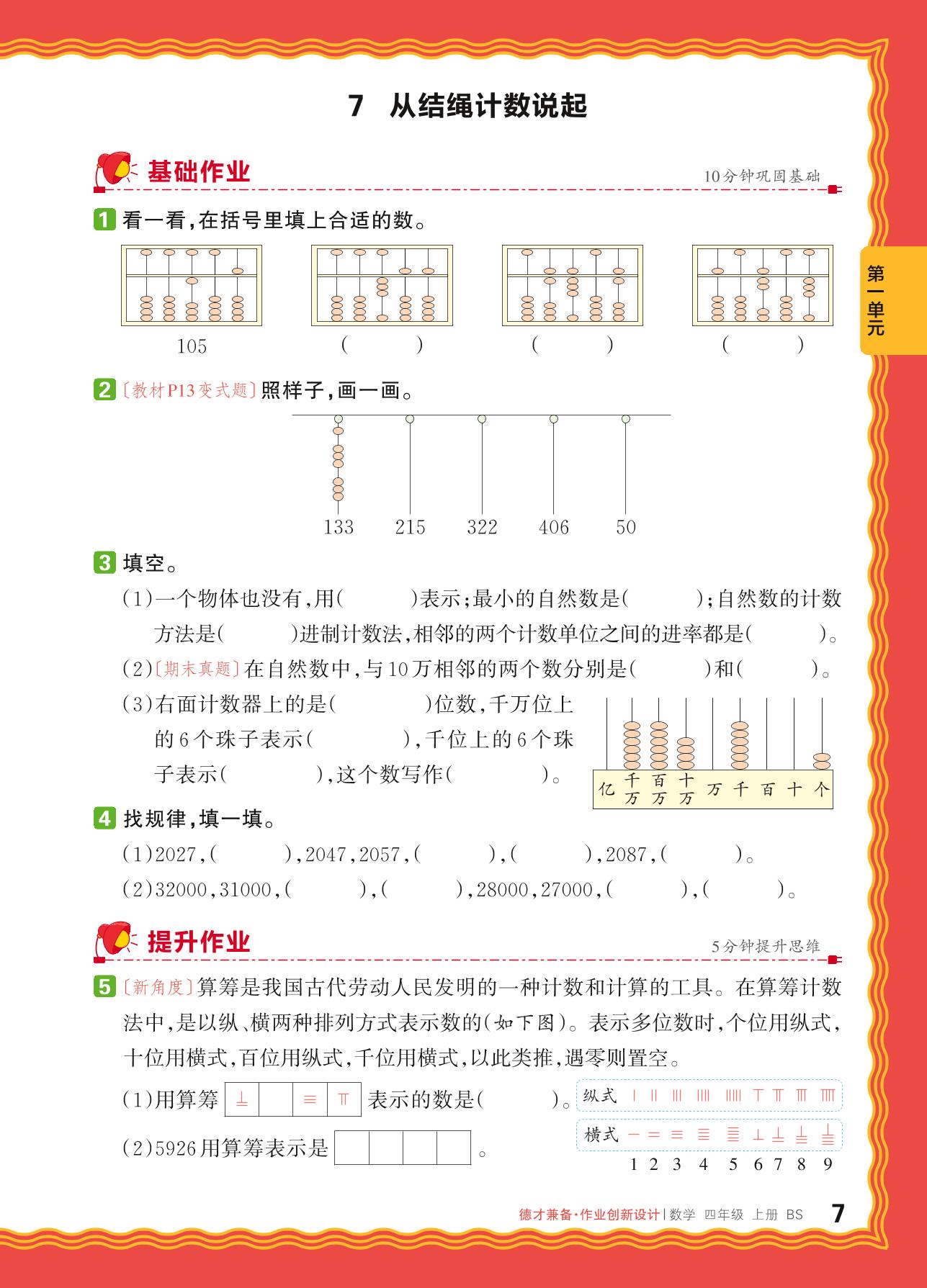 2024秋上册四年级数学北师版 第一单元 认识更大的数——7. 从结绳计数说起