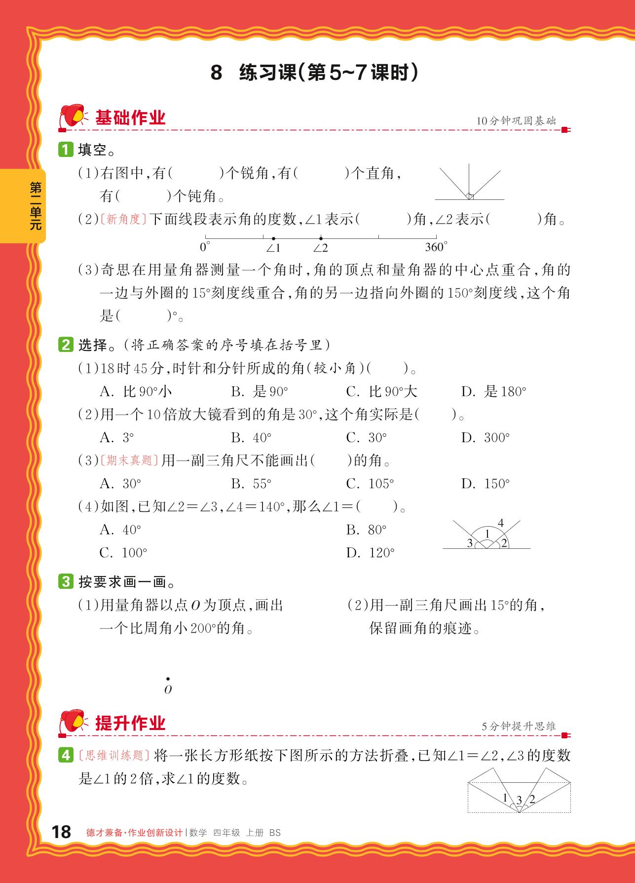 2024秋上册四年级数学北师版 第二单元 线与角——8. 旋转与角、角的度量(一)、角的度量(二)练习课