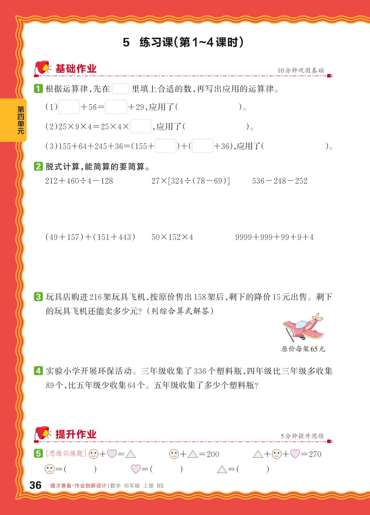 2024秋上册四年级数学北师版 第四单元 运算律——5. 买文具、加法交换律和乘法交换律、加法结合律练习课