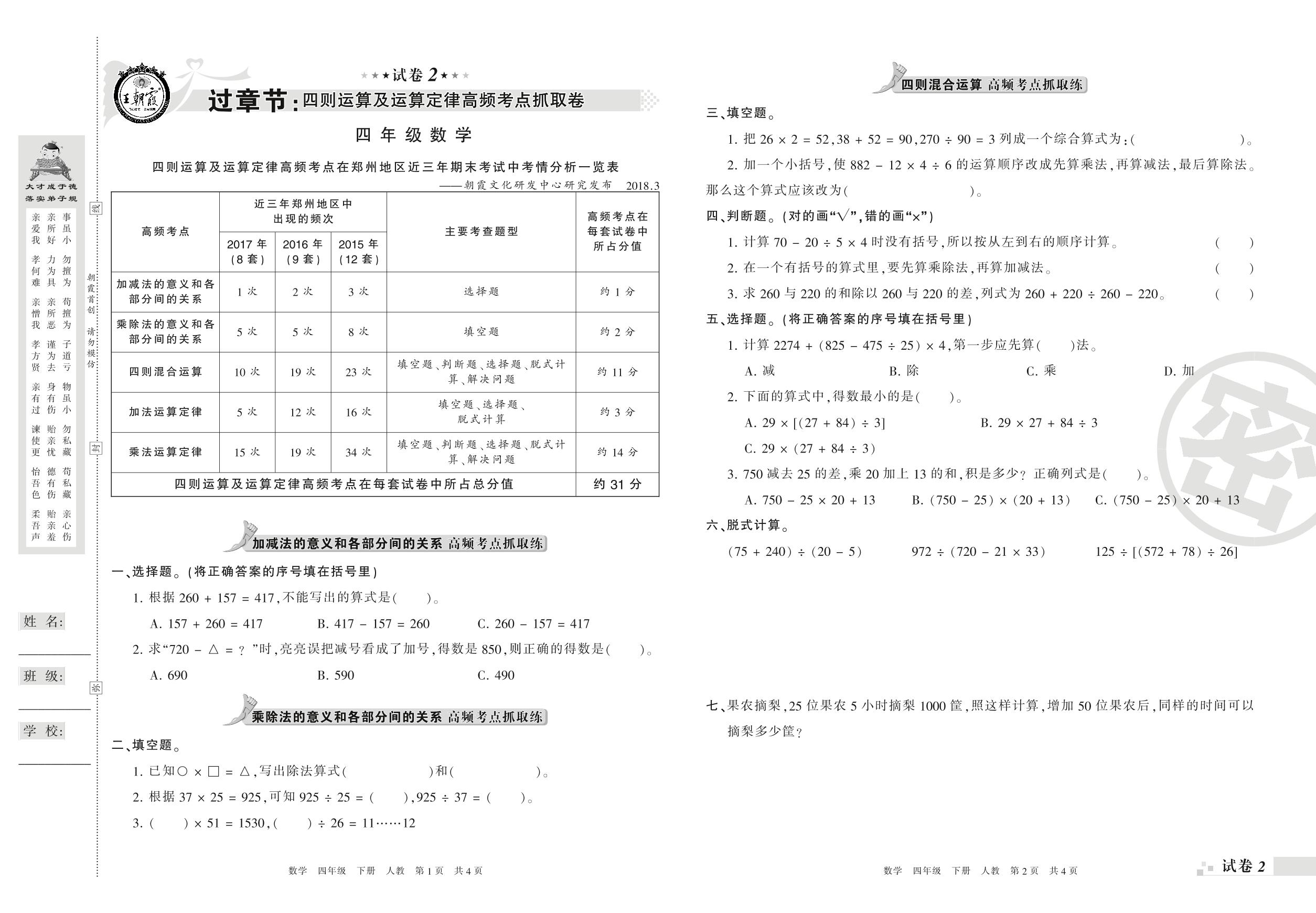 王朝霞期末过章节——四则运算及运算定律高频考点抓取卷四年级下册数学(人教版)_R210804160033【2】