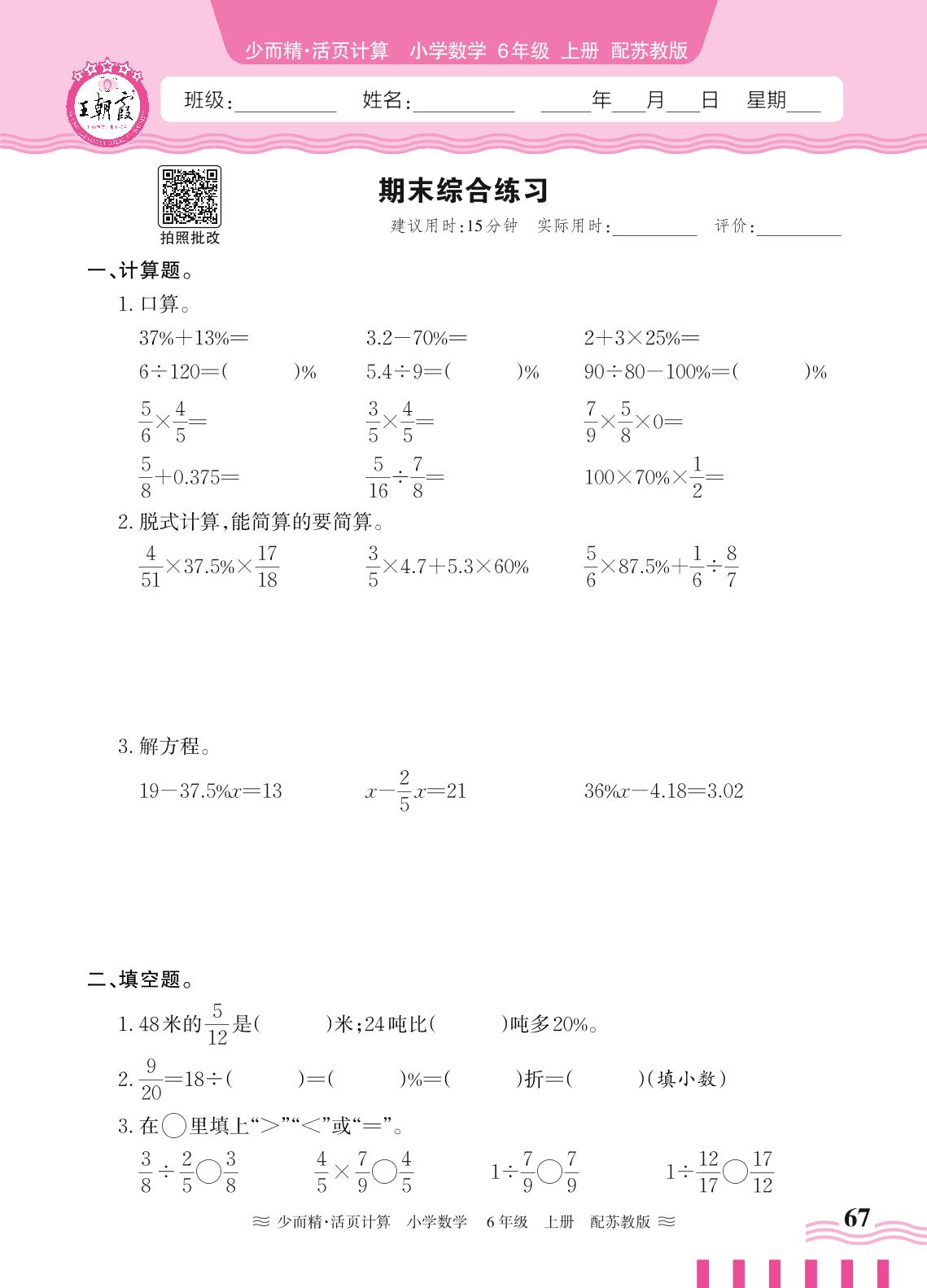 2024秋上册六年级数学苏教版 期末综合练习(计算专练)