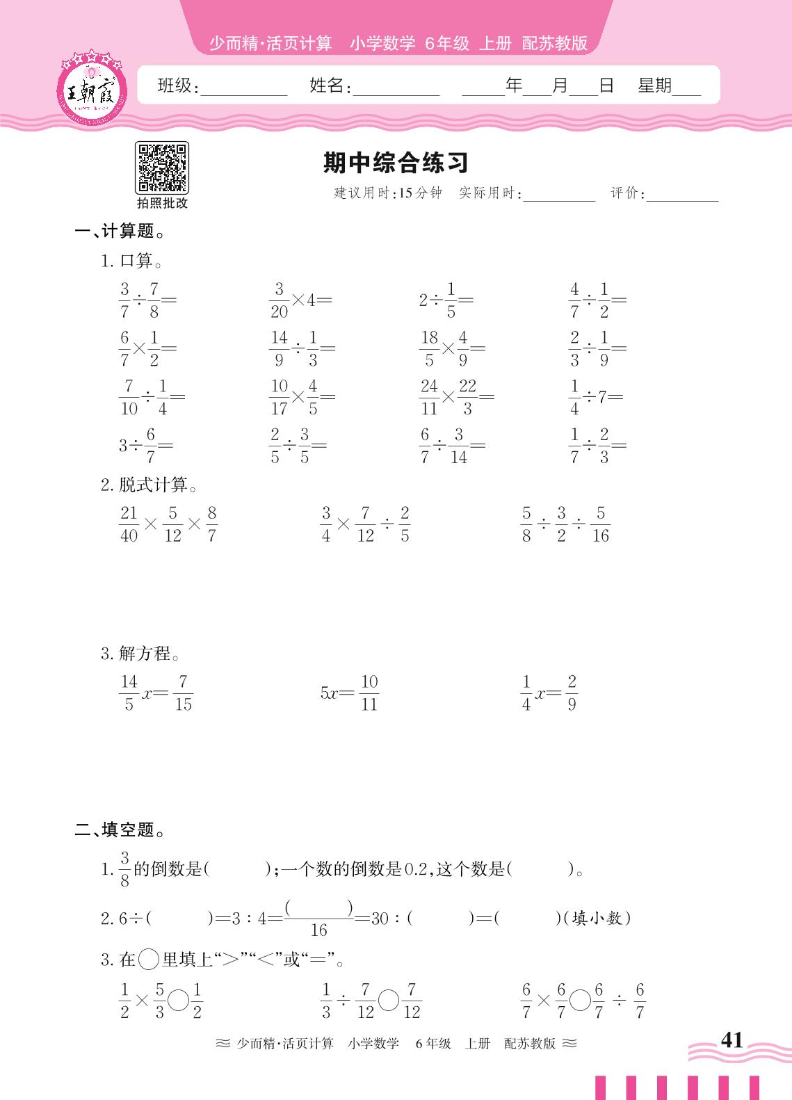 2024秋上册六年级数学苏教版 期中综合练习(计算专练)
