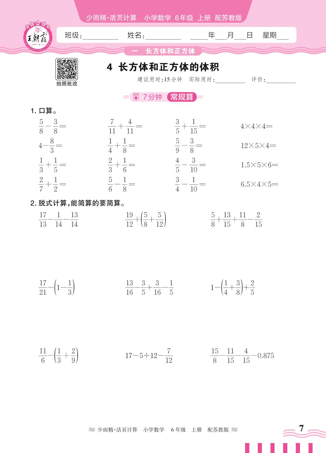 2024秋上册六年级数学苏教版 第一单元 长方体和正方体——4. 长方体和正方体的体积