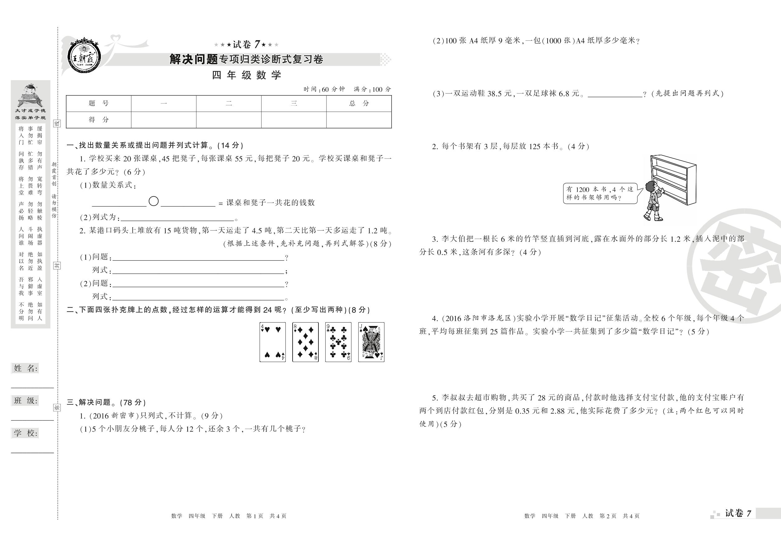 王朝霞期末专项卷——解决向题专项归类诊断式复习卷四年级下册数学(人教版)_R210804160045【7】