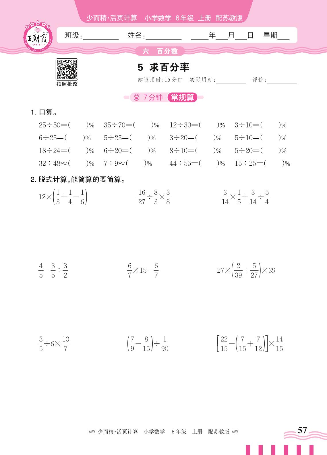 2024秋上册六年级数学苏教版 第六单元 百分数——5. 求百分率