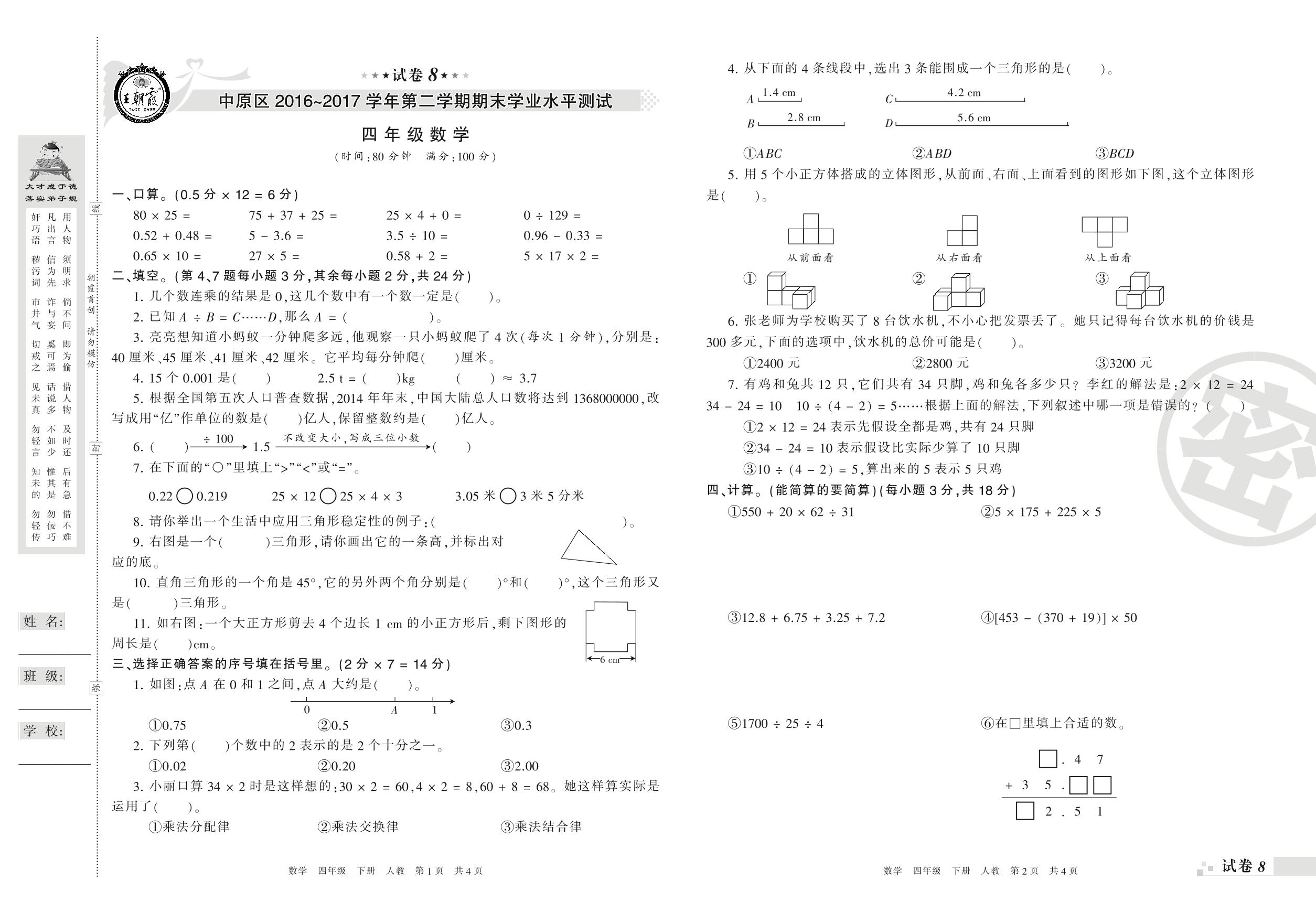 2016-2017学年第二学期郑州市中原区四年级数学试卷(人教版)【8】