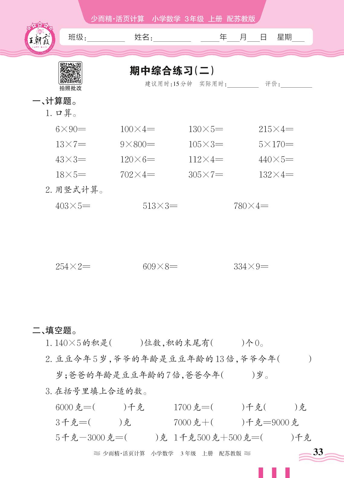 2024秋上册三年级数学苏教版 期中综合练习(二)(计算专练)