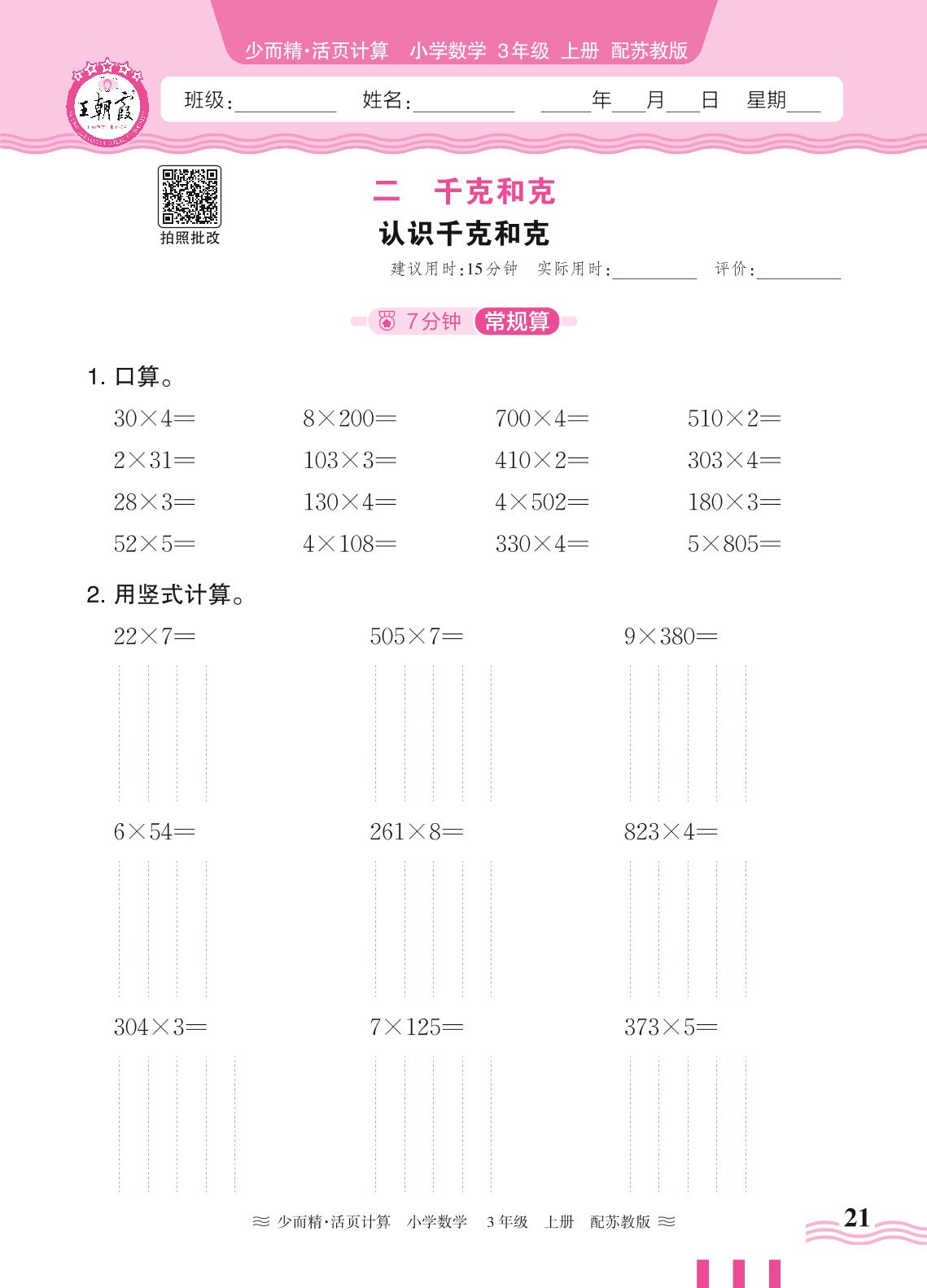 2024秋上册三年级数学苏教版 第二单元 千克和克——认识千克和克