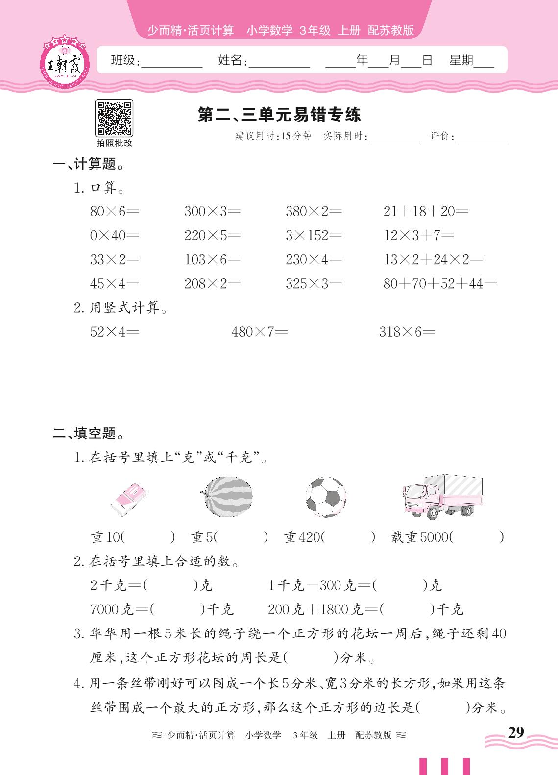 2024秋上册三年级数学苏教版 第二、三单元易错专练