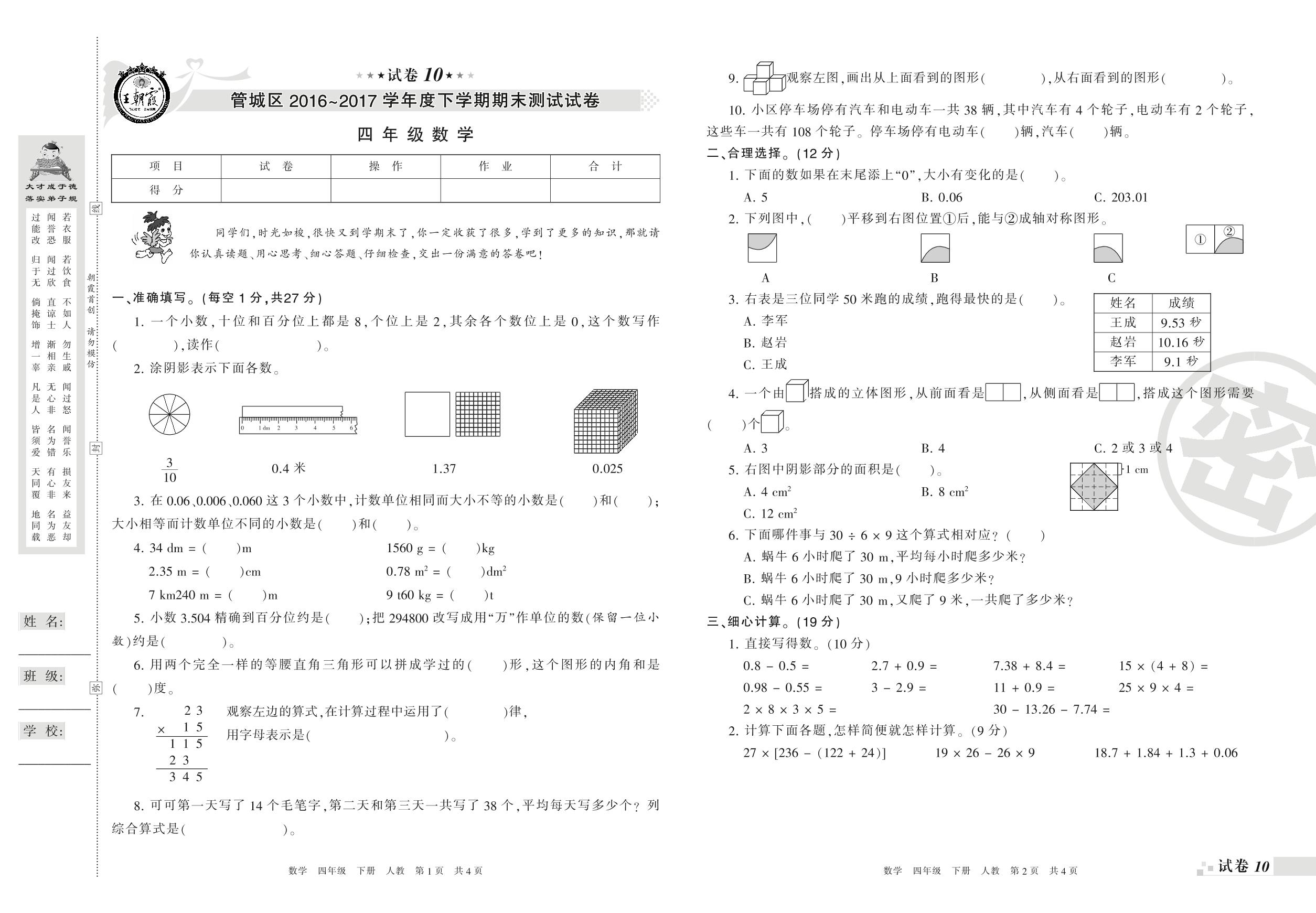 2016-2017学年第二学期郑州市管城区四年级数学试卷(人教版)【10】
