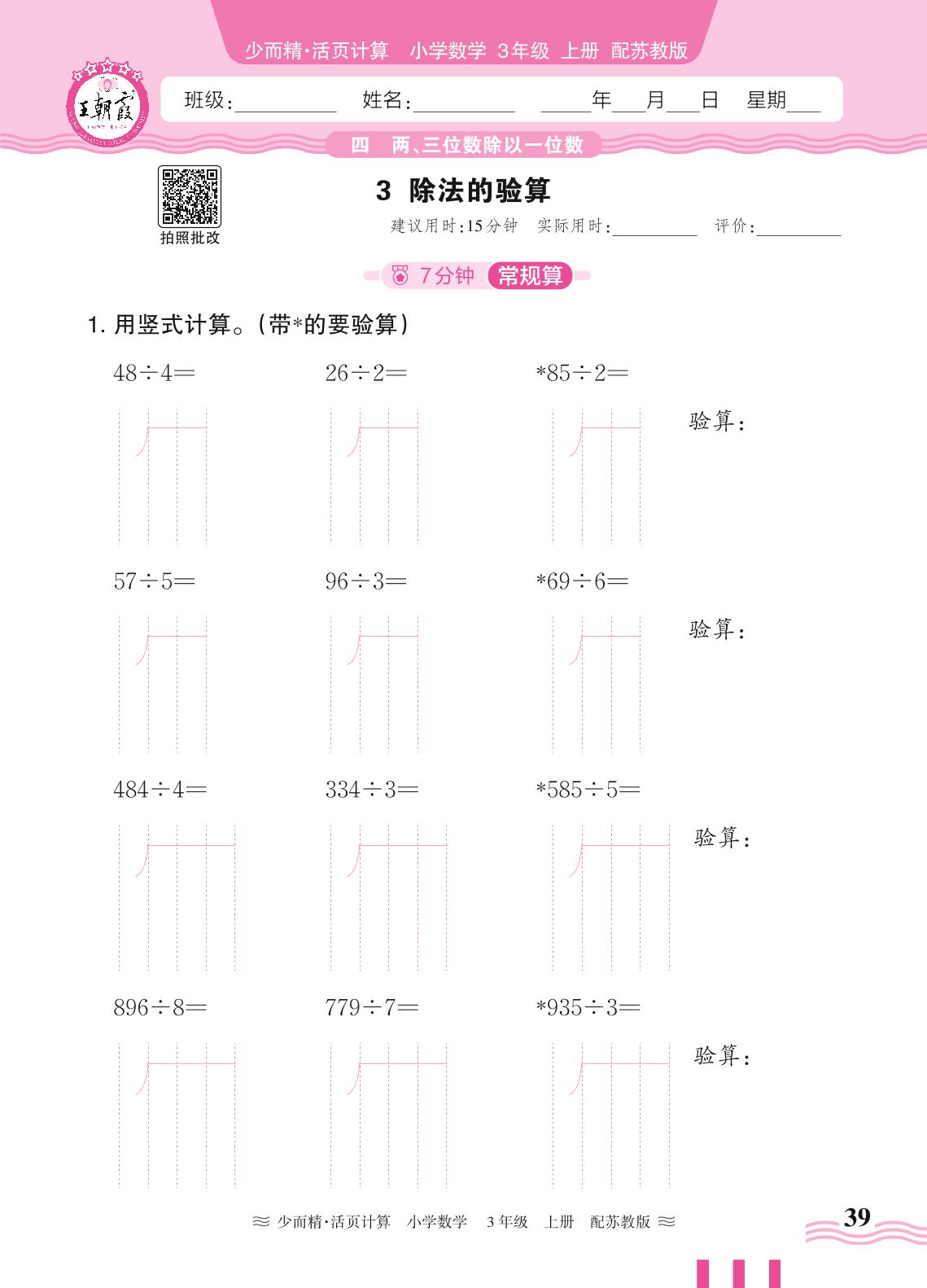2024秋上册三年级数学苏教版 第四单元 两、三位数除以一位数——3. 除法的验算